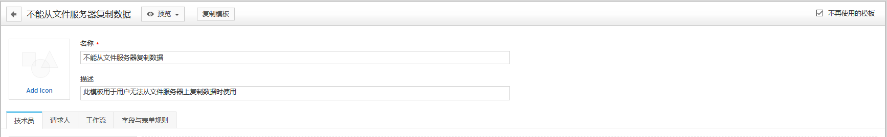 SDAdmin角色的用户能够为事件和服务创建模板。设置请求模板的表单,一般包括技术员及请求人的表单画面配置、工作流以及字段和表单规则等内容。