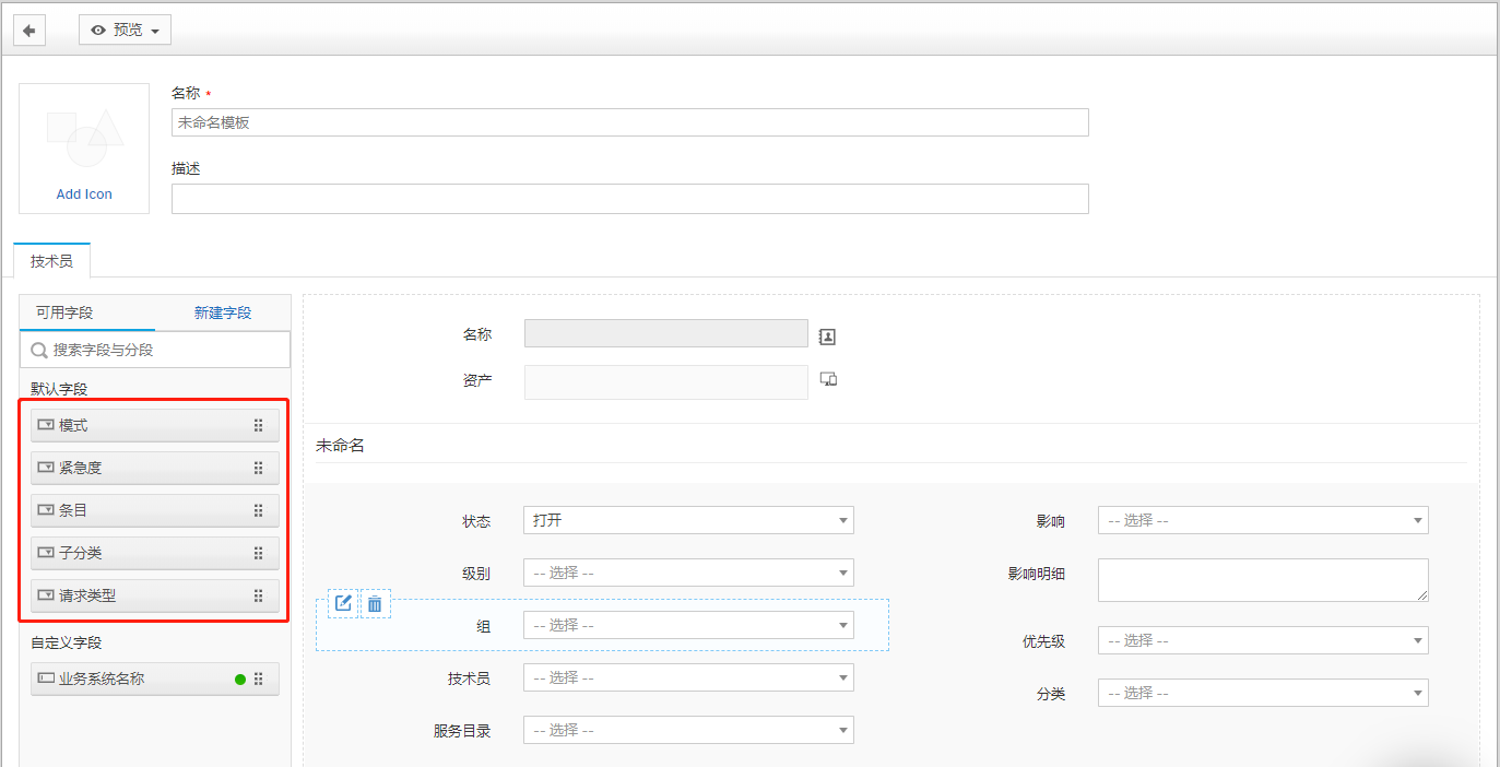 缺省下,所有可用字段将列在画布左侧面板里。除了状态、主题和描述字段,您可以编辑或移除所有其它的字段。移除的字段将会列在左侧面板的可用字段列表里。