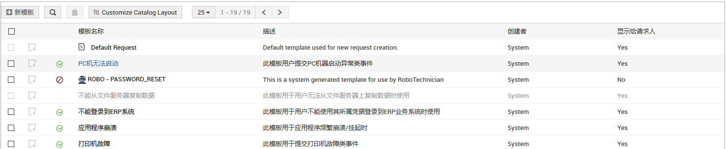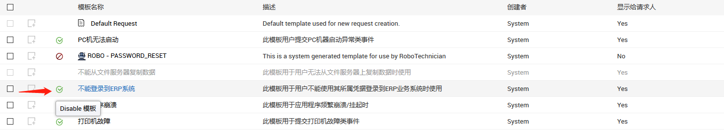在请求模板列表页面,可以使用启用或禁用图标,来对特定的模板执行启用或禁用操作。