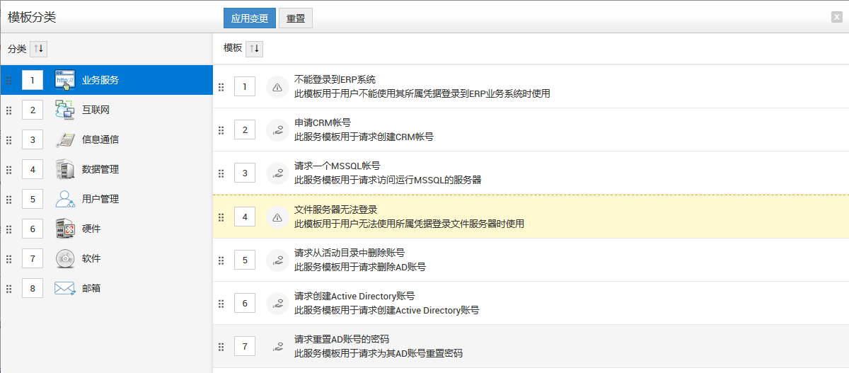 您可以对模板进行重新排序,点击页面顶部的自定义目录布局按钮,在模板分类页面,点击右上角的重新排序按钮,在排序窗口通过鼠标拖放,将不同的服务放置到您想要的位置。
