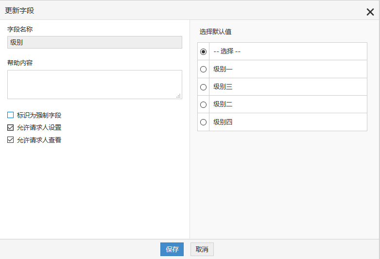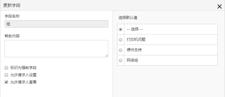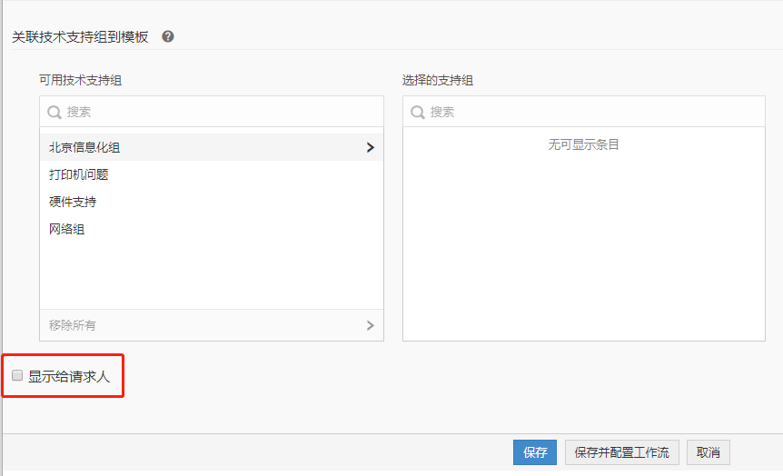 允许请求人使用模板来提交工单,需要将模板授权给请求人。勾选表单底部的显示给请求人选项,启动此功能。当您启动此选项后,可用的用户组(如果您已经添加了用户组)将显示出来 ,这里您可以选择那些用户组下的用户,可以使用此模板。如果不做设置,将默认所有的用户都可以使用此模板。