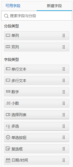 点击新建字段标签,在分段类型部分,选择单列或双列分段,将其拖放到画布。