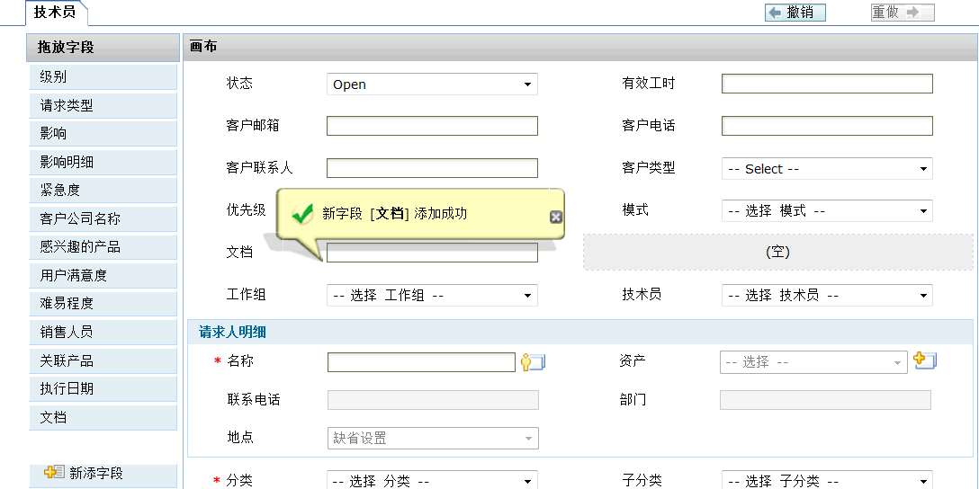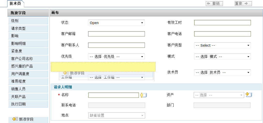 点击关闭字段按钮图标 可以从画布中移除字段,被移除的字段将显示在字段列表中,下述字段:状态、优先级、描述,以及请求人明细不能被移除。