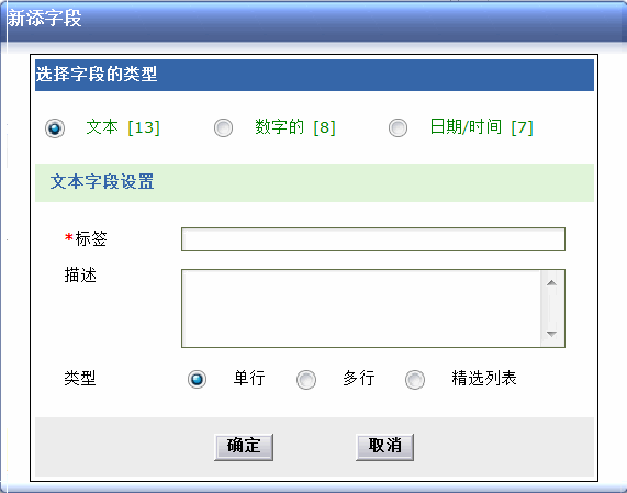 如果选择文本字段,还可以指定文本字段的类型,如:单行文本,多行文本,精选列表等。