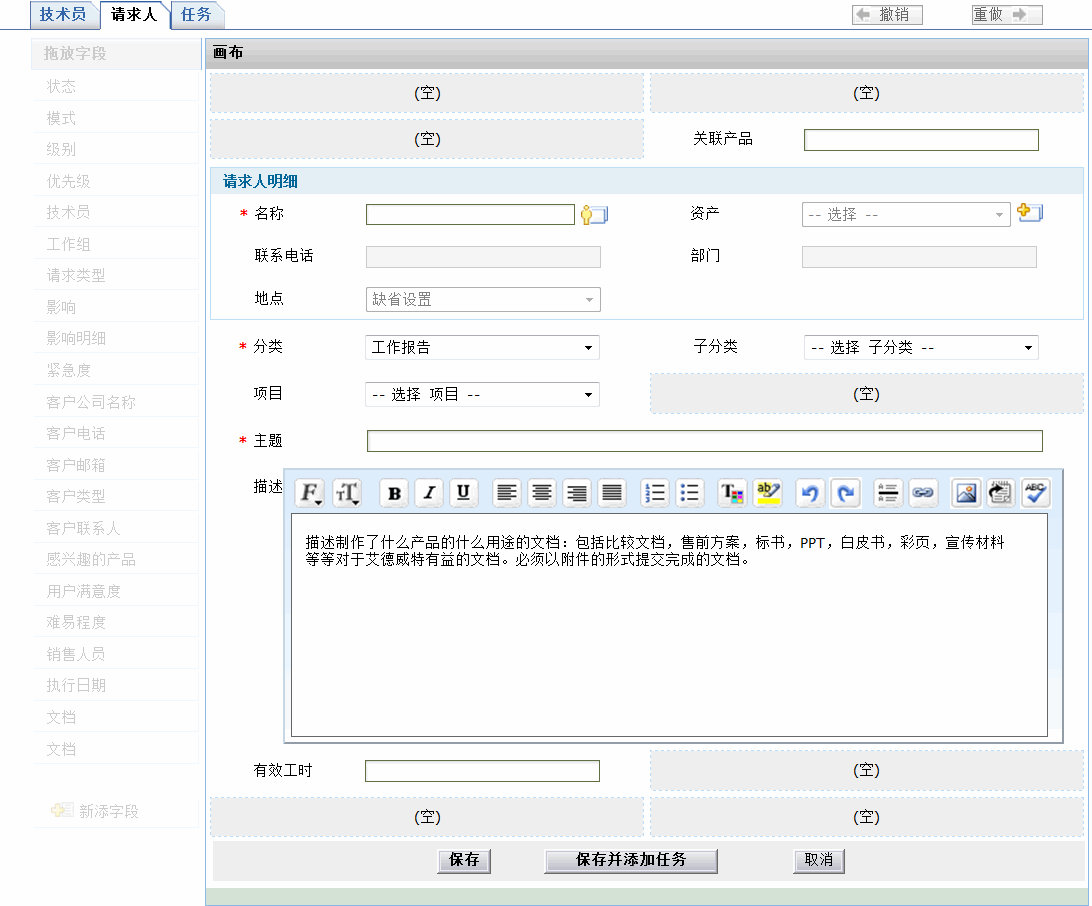 如果请求模板的“显示给请求人”选项被启用,则会在该画面中显示请求人页签。点击请求人页签,可以预览请求人的表单。相比于技术员的表单,请求人的表单内容要少很多,因为有些内容已经隐藏。而且在请求人表单画面,不能添加,删除字段,只能调整布局。