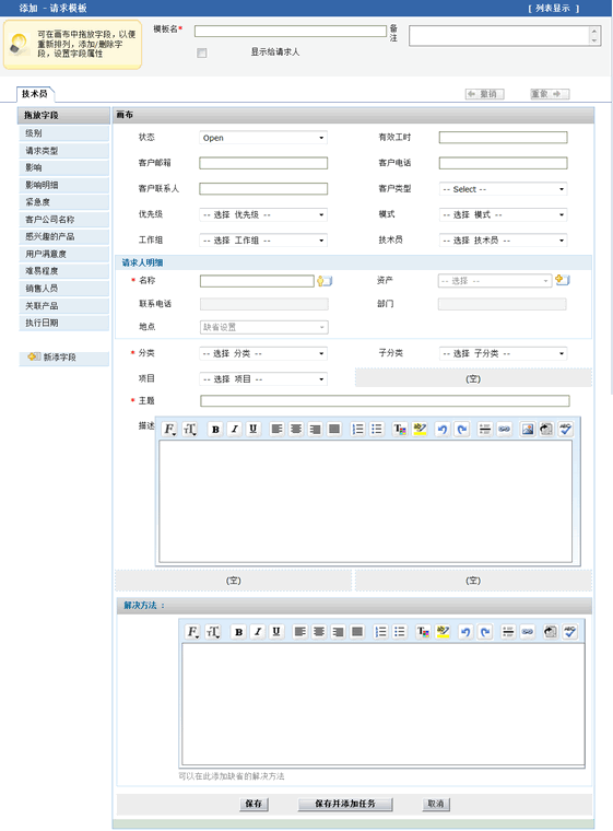 从请求模板的列表画面,点击想要预览的模板名。打开请求模板画面。缺省显示技术员的请求表单。在这里可以添加,重新布局,删除请求字段,并且设置字段的属性。