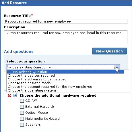 添加资源信息的过程就是回答一系列问题。因此,需要设置好需要请求人回答的问题,问题的格式包括:简单的问题(回答是/否),下拉框(供请求人从中选择)、文本框(需请求人输入),复选框等。
