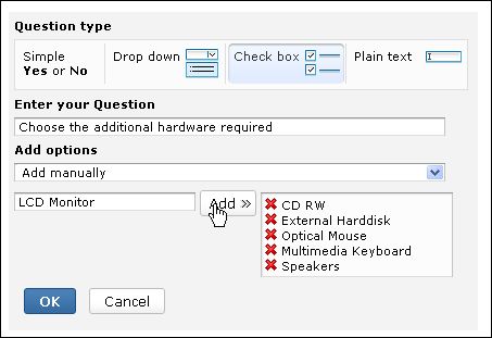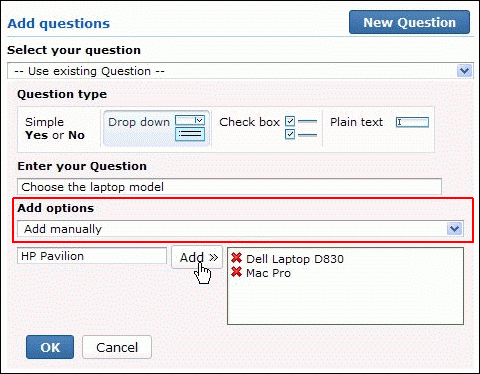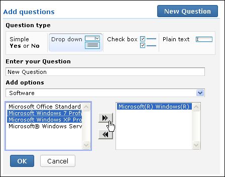 在新添问题窗口中,输入问题,选择问题的格式。如果选择问题的格式为复选框或者下拉框,将会出现添加可选项,其中列出了系统中定义的所有产品类型。比如:您选择软件,则会列出所有可管软件。