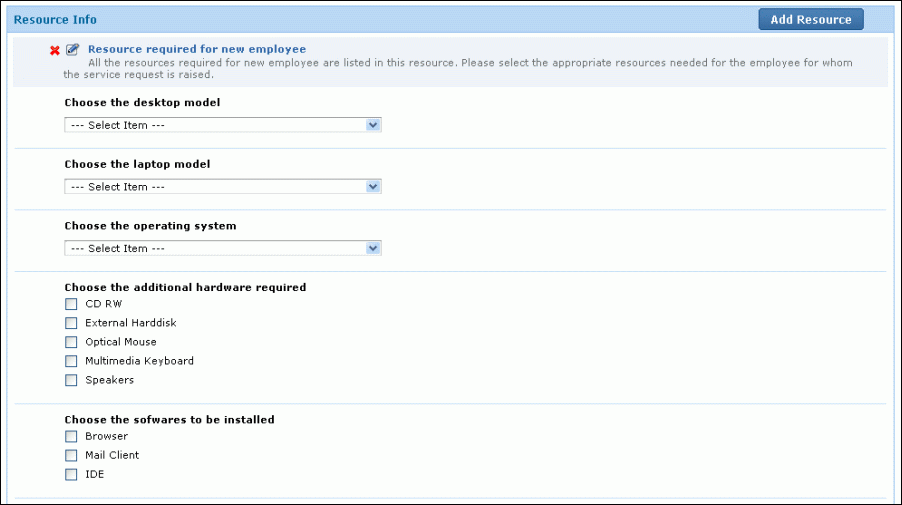 如果提供的服务涉及到资源,则需要在资源信息中进行配置。要注意的是:这里所说的资源,不仅包含狭义的软硬件资源、资产等,还包括提供该服务所需要/涉及的其它信息。 比如:新员工入职的服务请求,需要提供的资源信息可能包括:桌面机/便携电脑、要安装的软件、通讯设备、账号信息、联系方式等。
