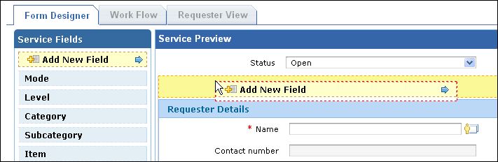要添加新的字段到服务请求表单,可以将新添字段的选项拖放至表单的空白处,将该字段放到表单中的黄色显示区域。