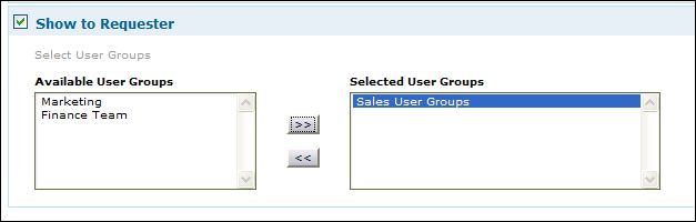 要想请求人也能访问该服务请求模板,需要选中显示给请求人的选项。如果定义了用户组,还可以进一步指定可访问该模板的用户组。这样只要指定组中的请求人才能访问该服务请求模板。如果不指定用户组,则所有请求人都可以访问该模板。