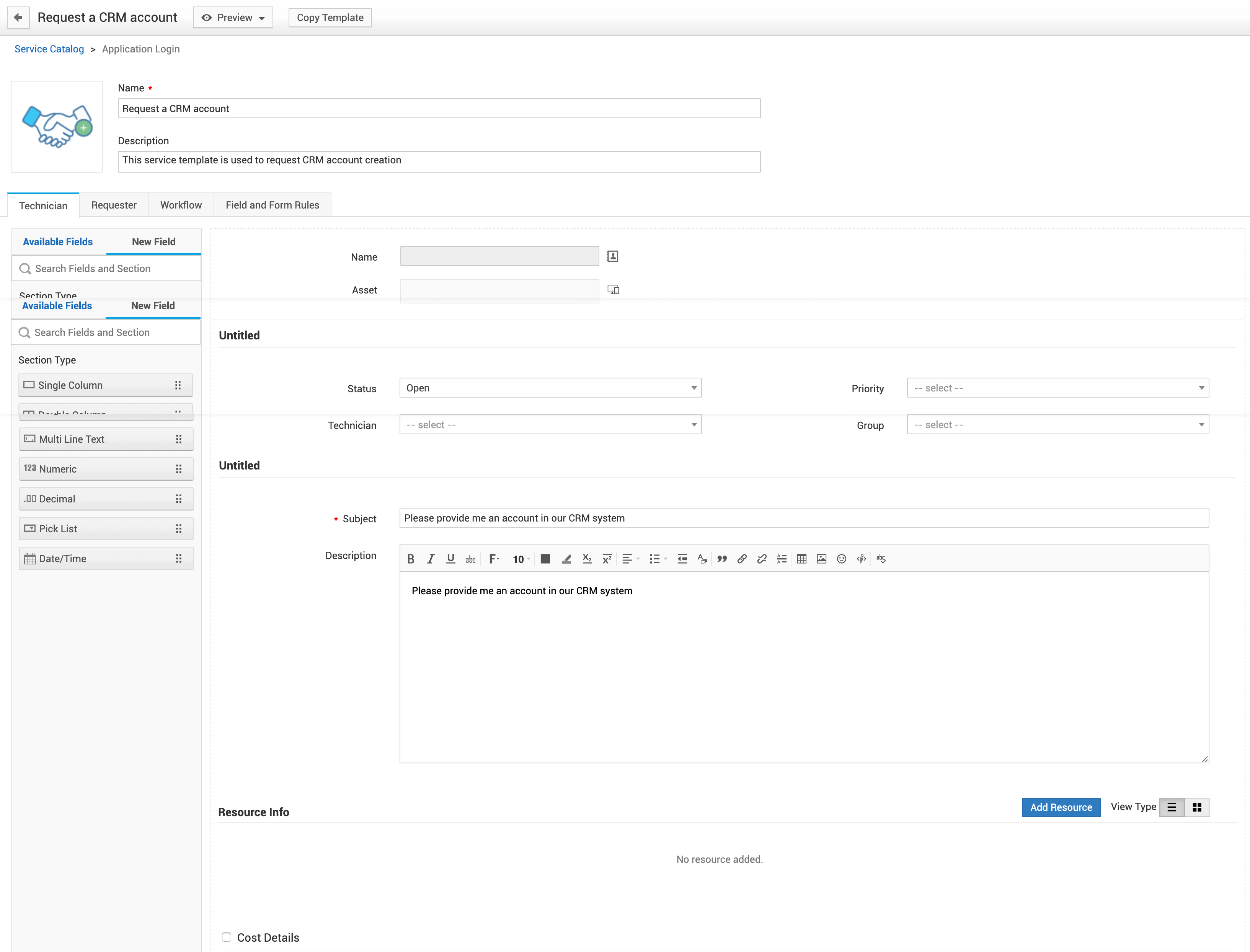 服务请求表单由一个拖放式模板组成,需要根据最终用户的需求进行配置。如果该服务需要任何资源,则可在“资源信息”块下进行相同配置。此外,您还可以配置多阶段审批、设置服务级别协议,并为各个服务请求分配任务。