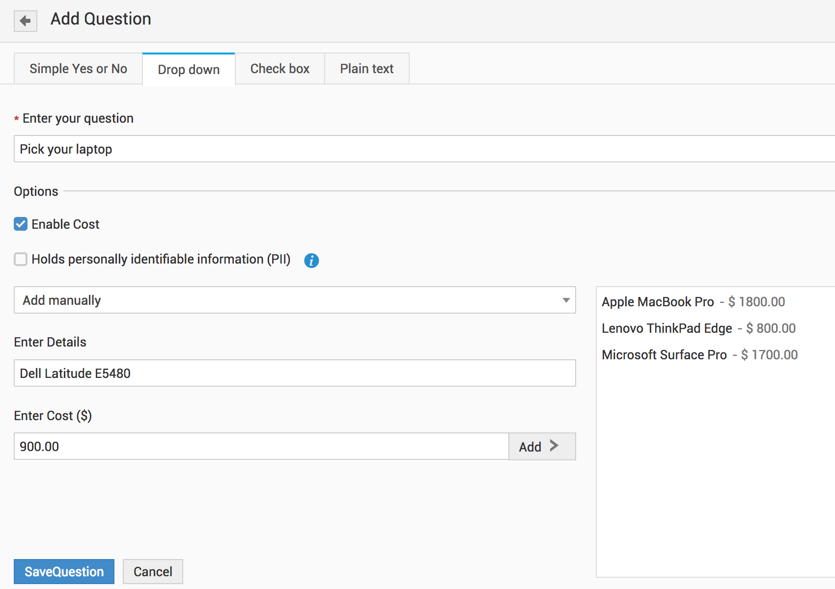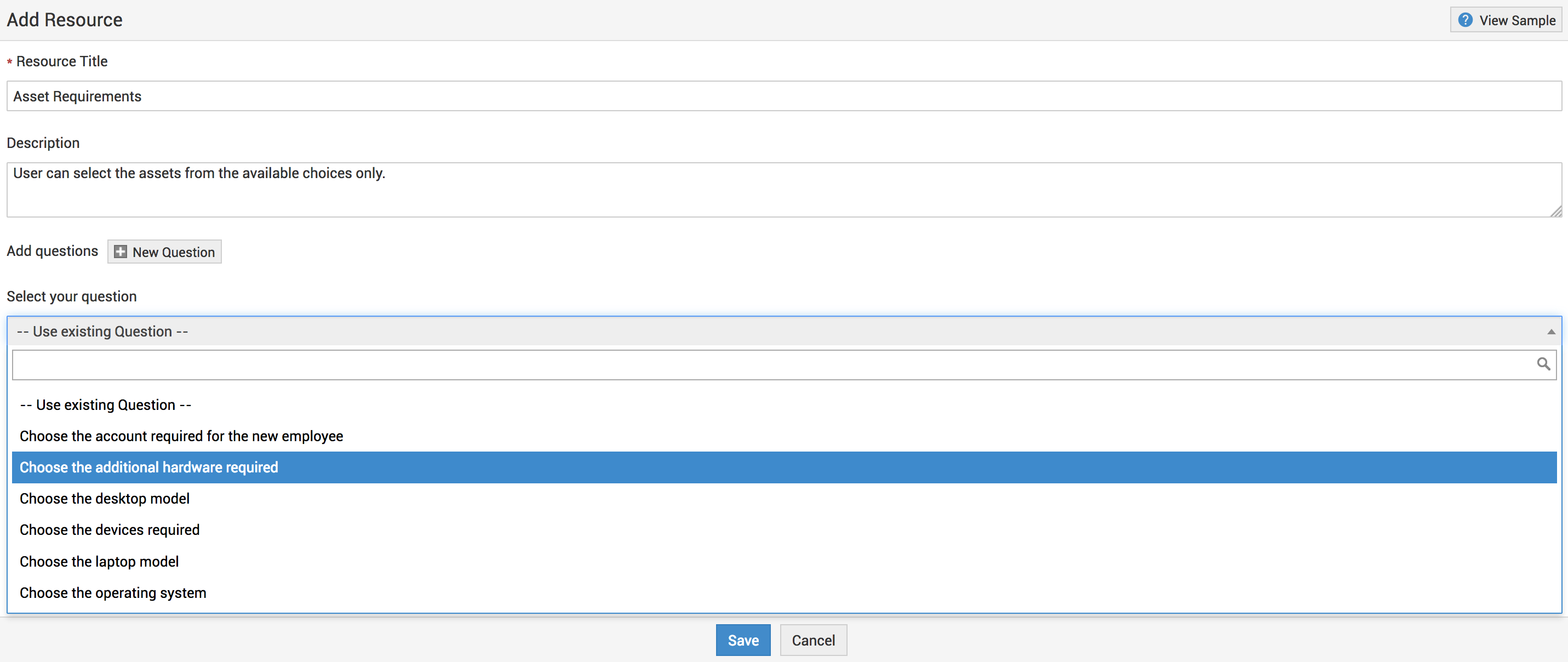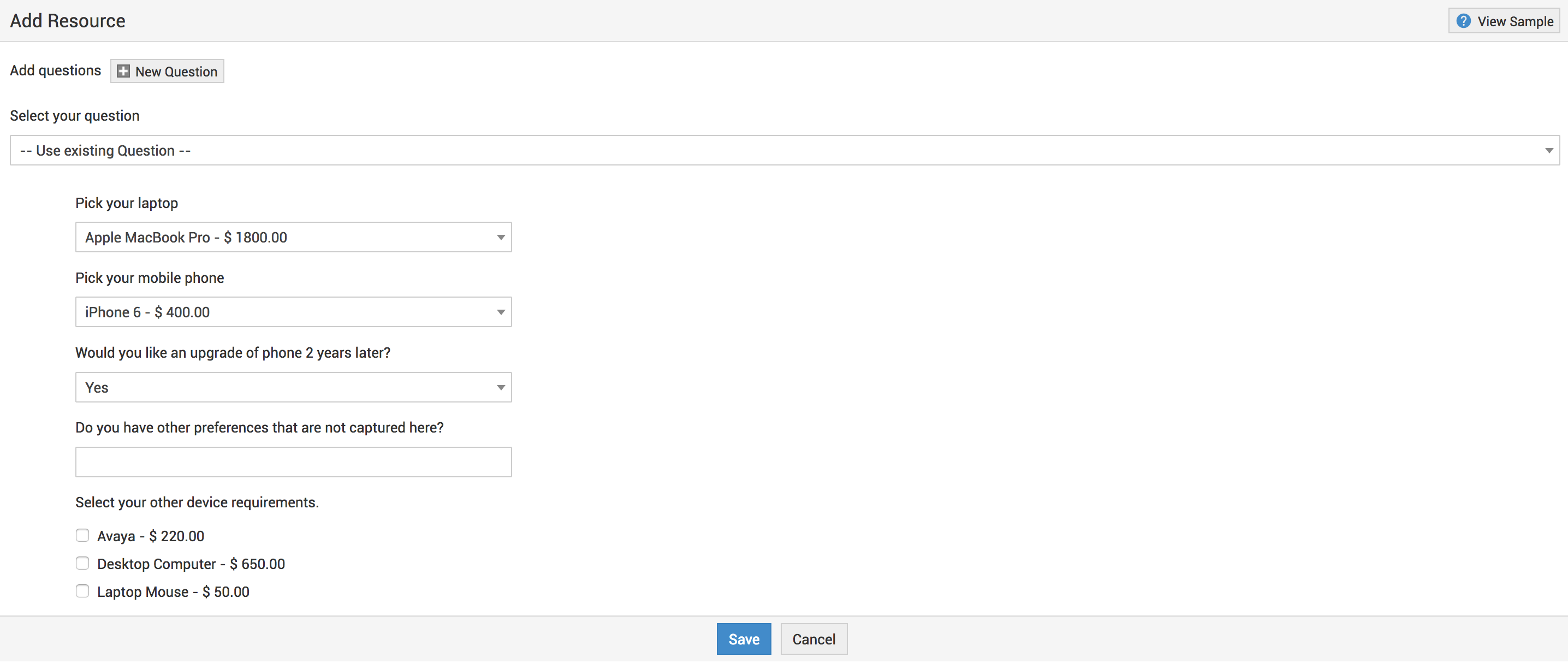 如果服务涉及任何资源,则可以在“资源信息”块下进行说明。添加资源的过程包括一系列问题,资源可以以下列任一格式显示:复选框、下拉列表、纯文本或简单的是/否。您还可以为资源问题中的各个选项添加成本。