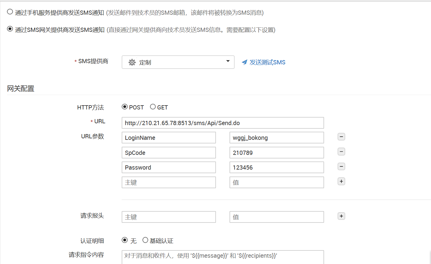 站点24x7和Clickatell需要Authtoken作为身份验证细节,BulkSMS需要用户名和密码。