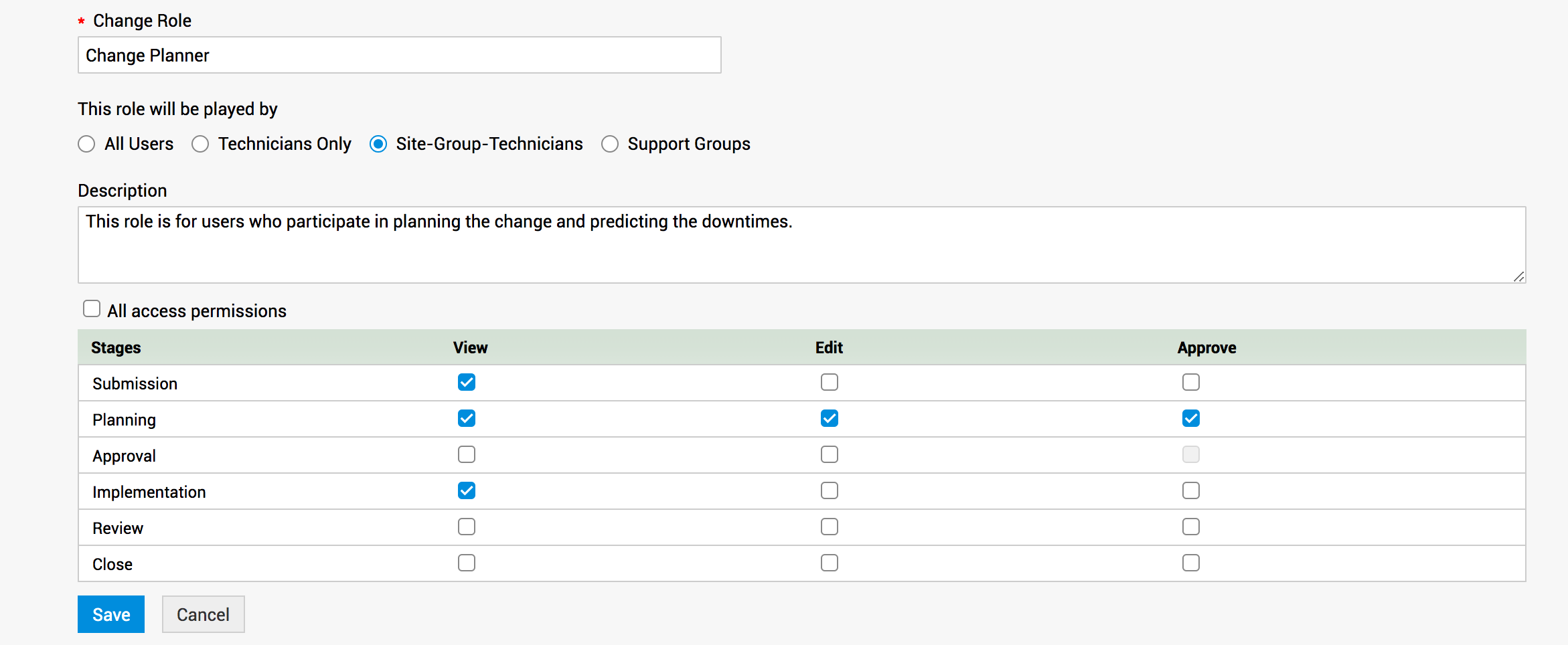 - 为该变更角色设置跨各阶段的访问权限。以下是变更生命周期中六个默认阶段的访问权限。