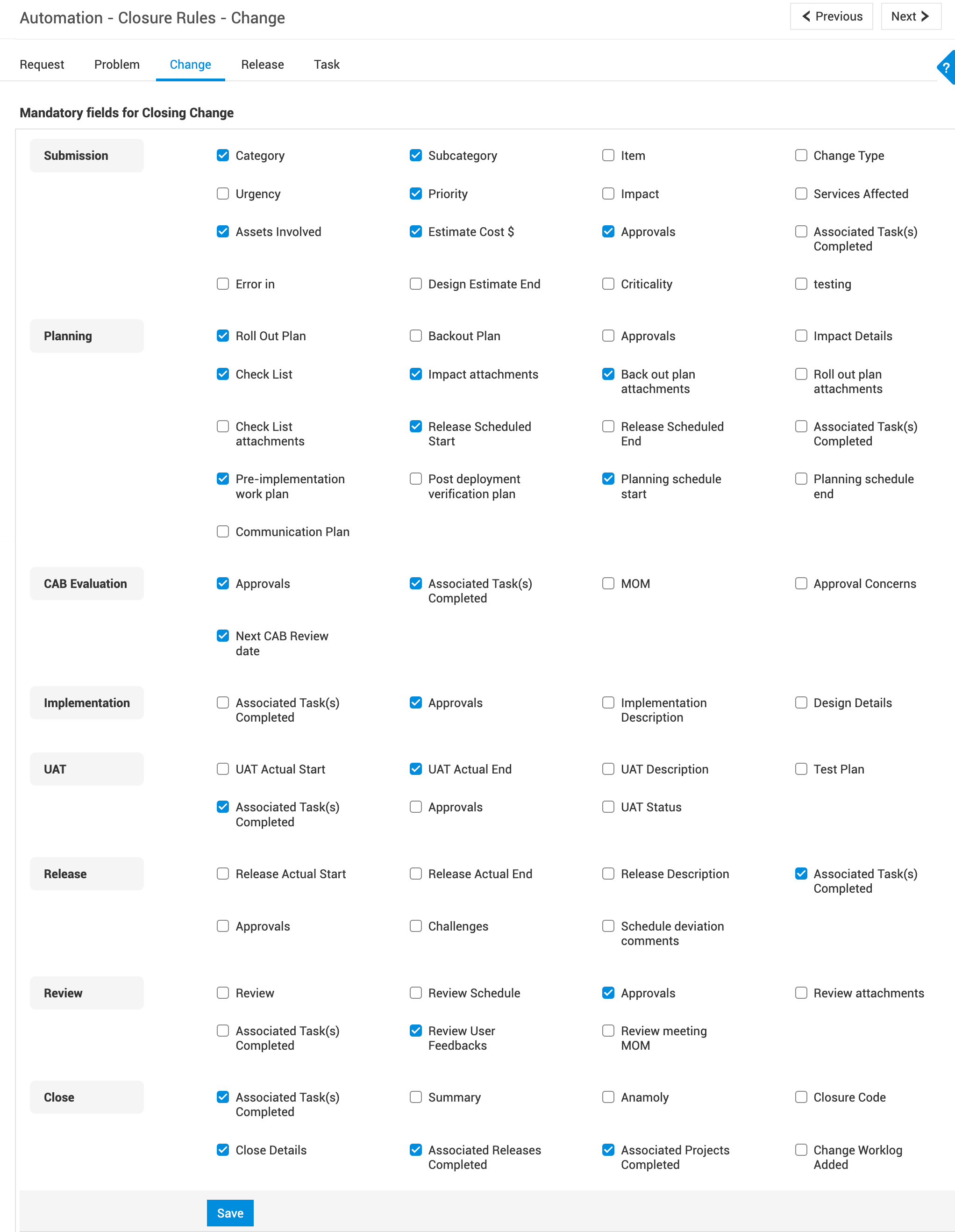 更改关闭规则允许管理员指定在关闭更改的每个阶段之前必须填写的必填字段。