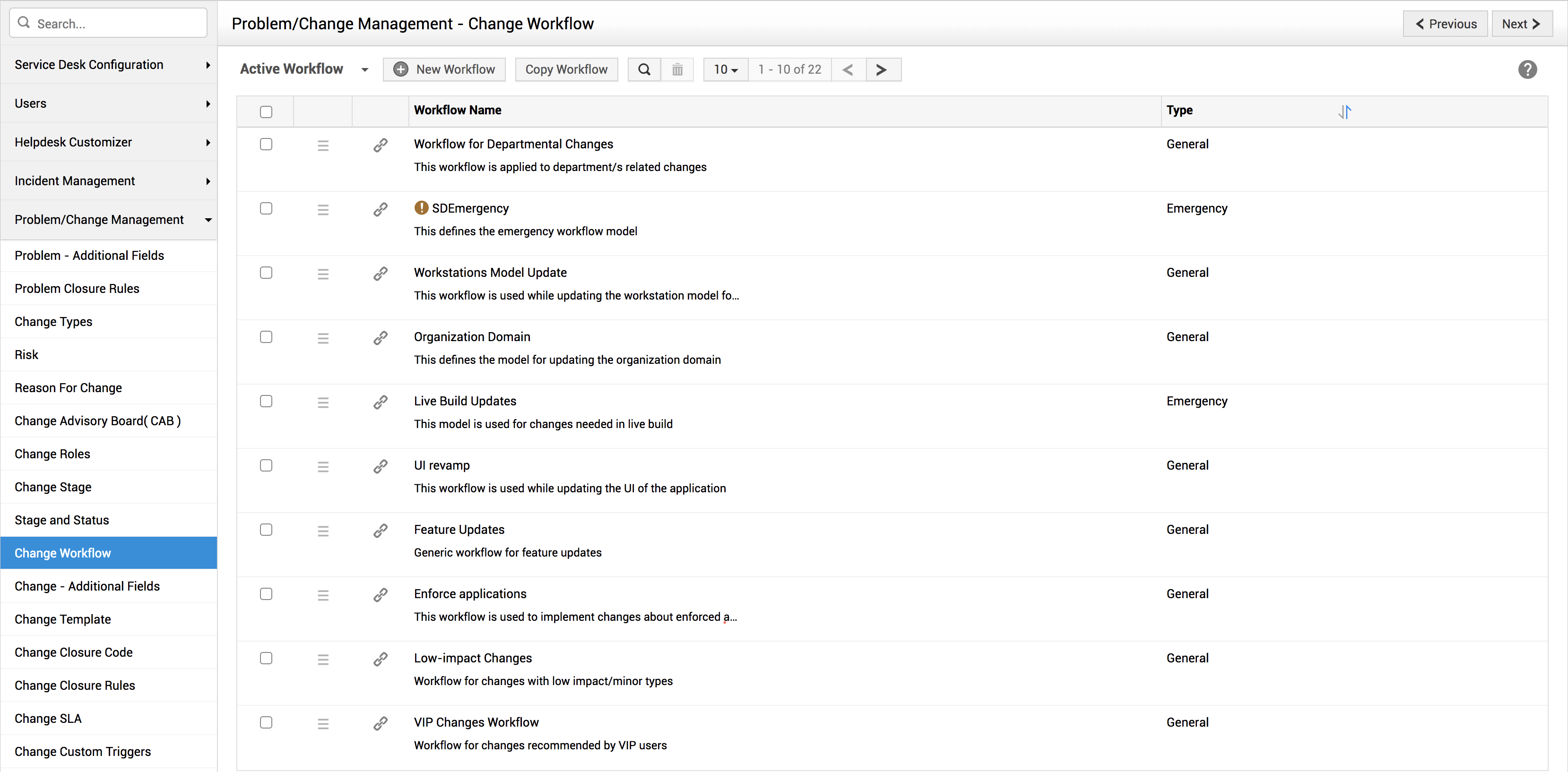 要添加、查看和管理变更工作流,请导航至 管理 >> 问题/变更管理 >> 变更工作流。您将进入变更工作流列表视图。