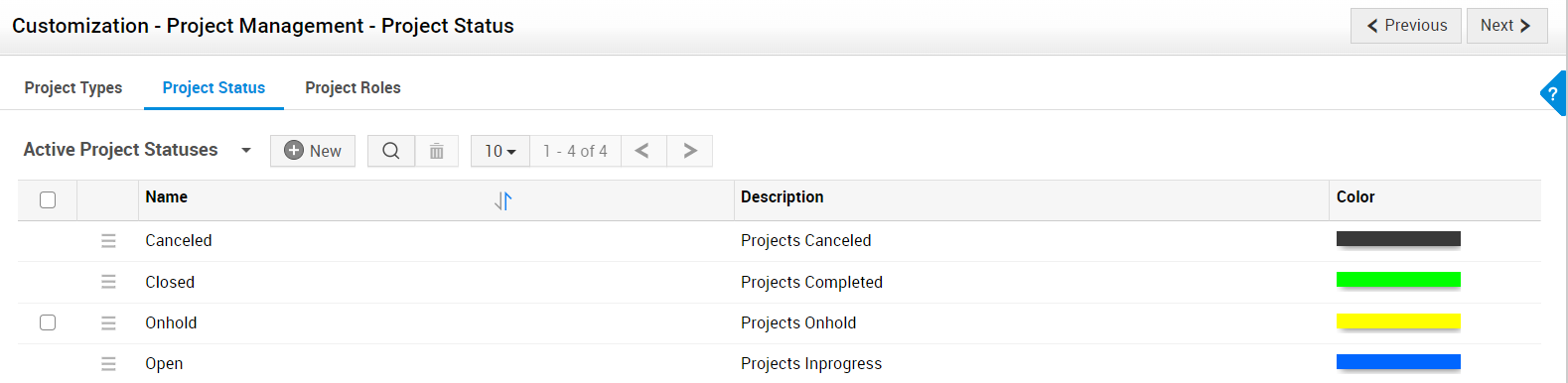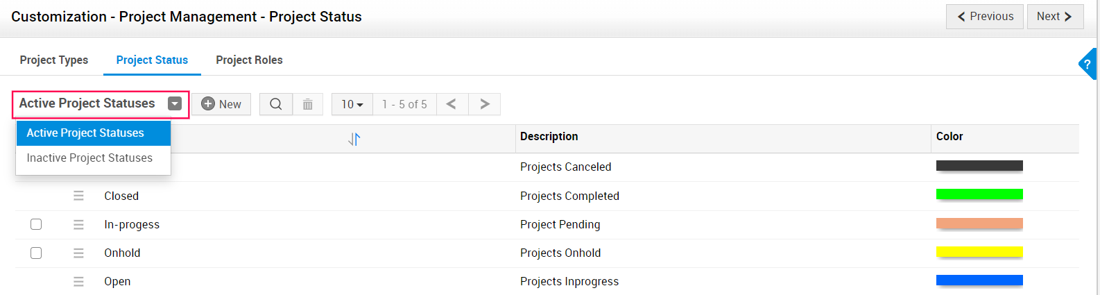 筛选项目状态 - 默认情况下,项目状态页面会显示活动的项目状态。单击“项目状态”下拉菜单,可在活动和非活动项目状态之间切换。