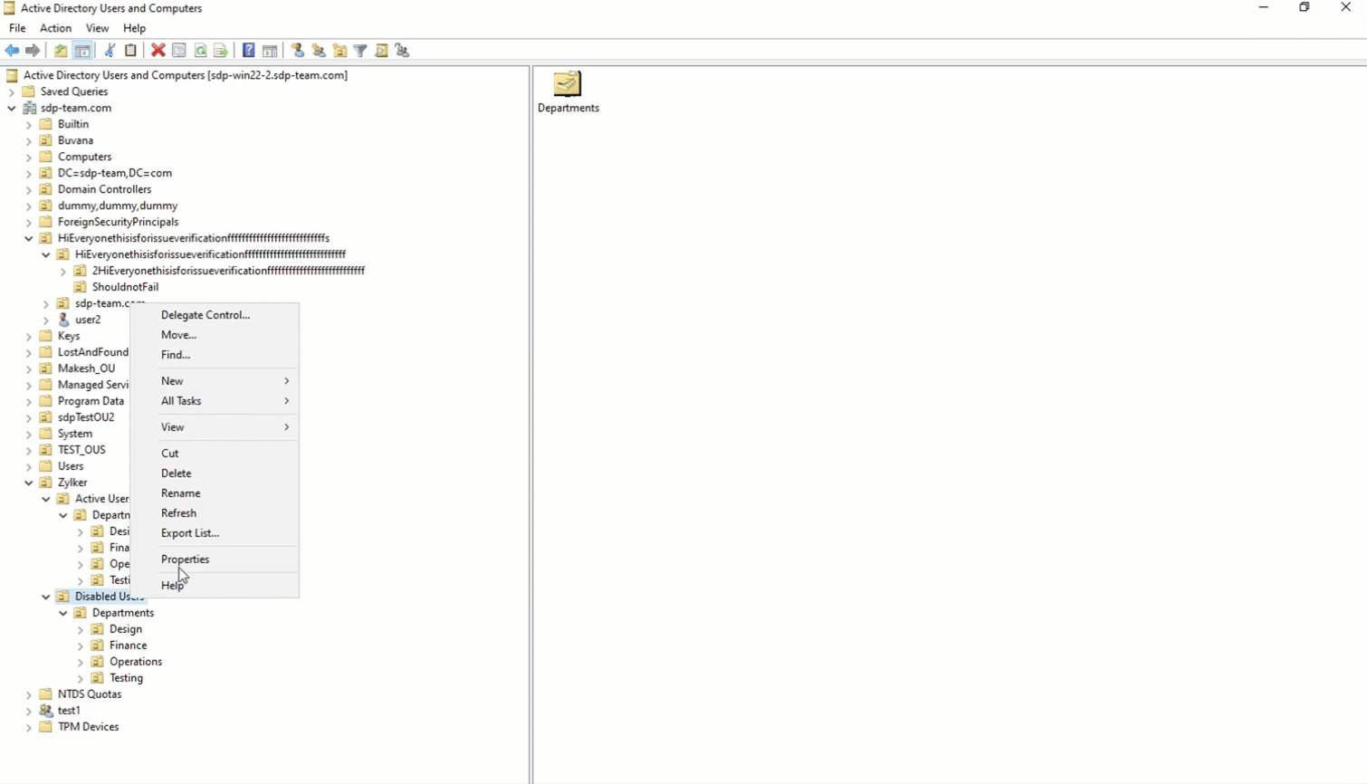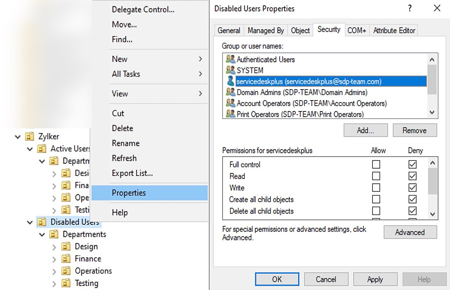 首先,为了限制服务帐户访问Disabled Users OU,请右键单击该 OU 并选择属性。然后,转到安全选项卡,如下所示: