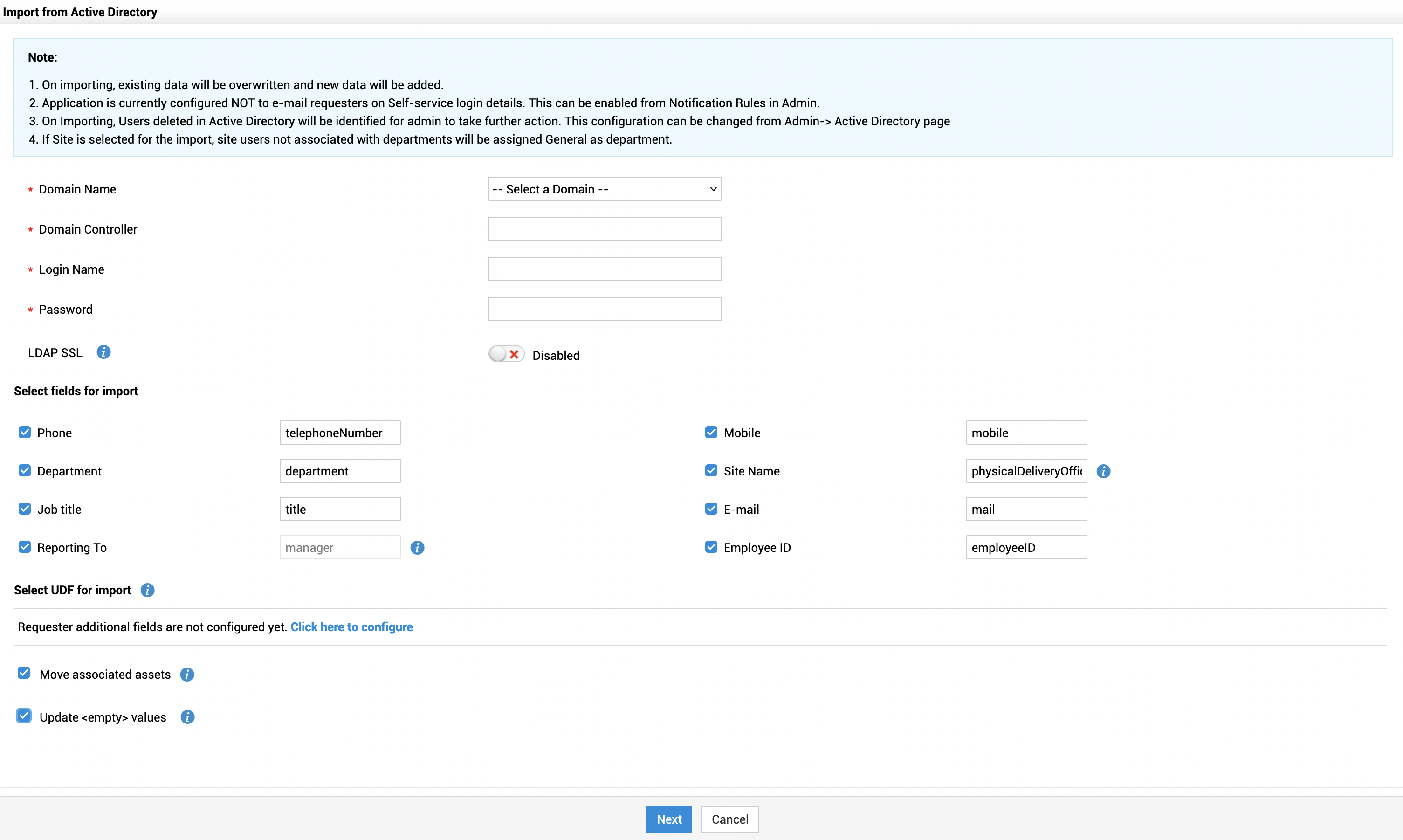 - 将使用用户的“loginname+domainname”作为唯一标识符来更新 ServiceDesk Plus 中的用户详细信息。