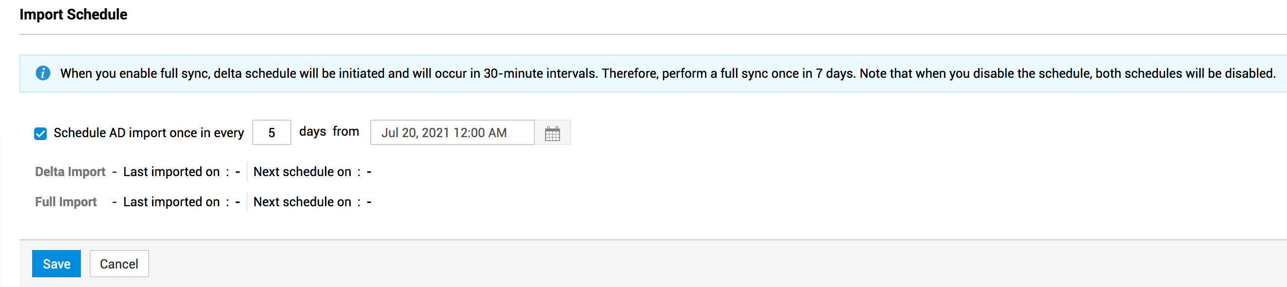 域中的用户详细信息将根据开始日期和时间之后所指定的天数定期导入。数据差异将每 30 分钟更新一次。您可以在导入计划部分查看上次导入时间和下次计划时间。