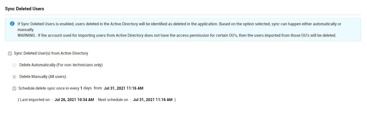 此选项允许您将 Active Directory 中已删除的用户同步到 ServiceDesk Plus。已删除用户的同步会在手动导入后进行。