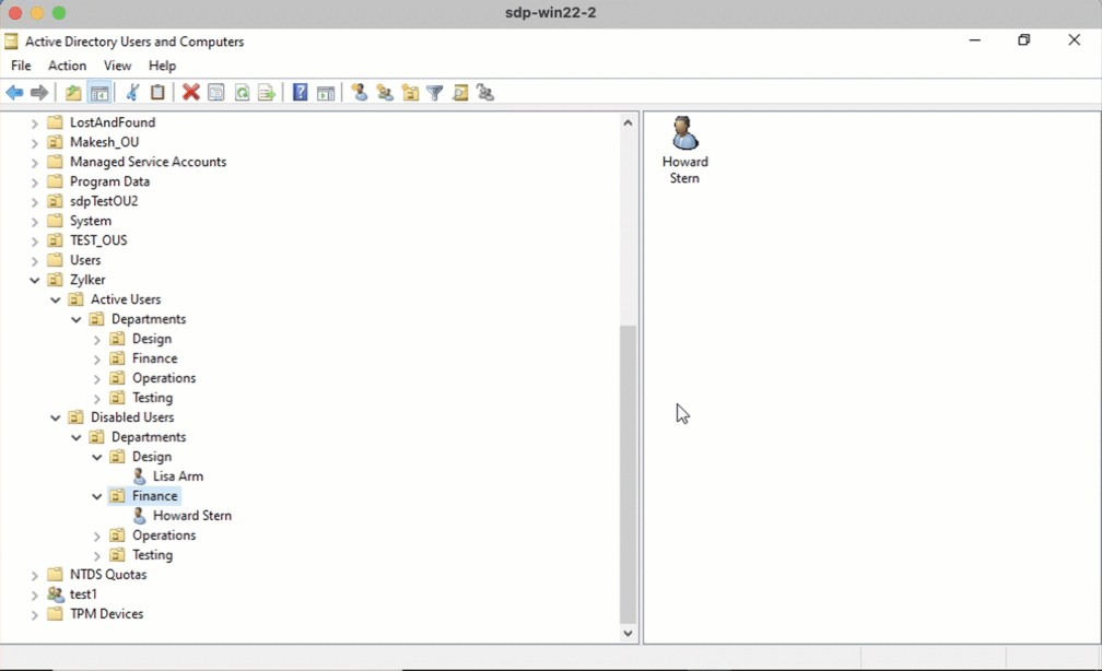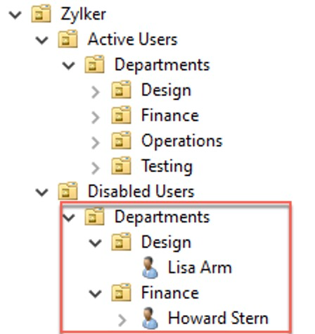 如下所示,Design OU 包含用户 Lisa Arm,Finance OU 包含用户 Howard Stern: