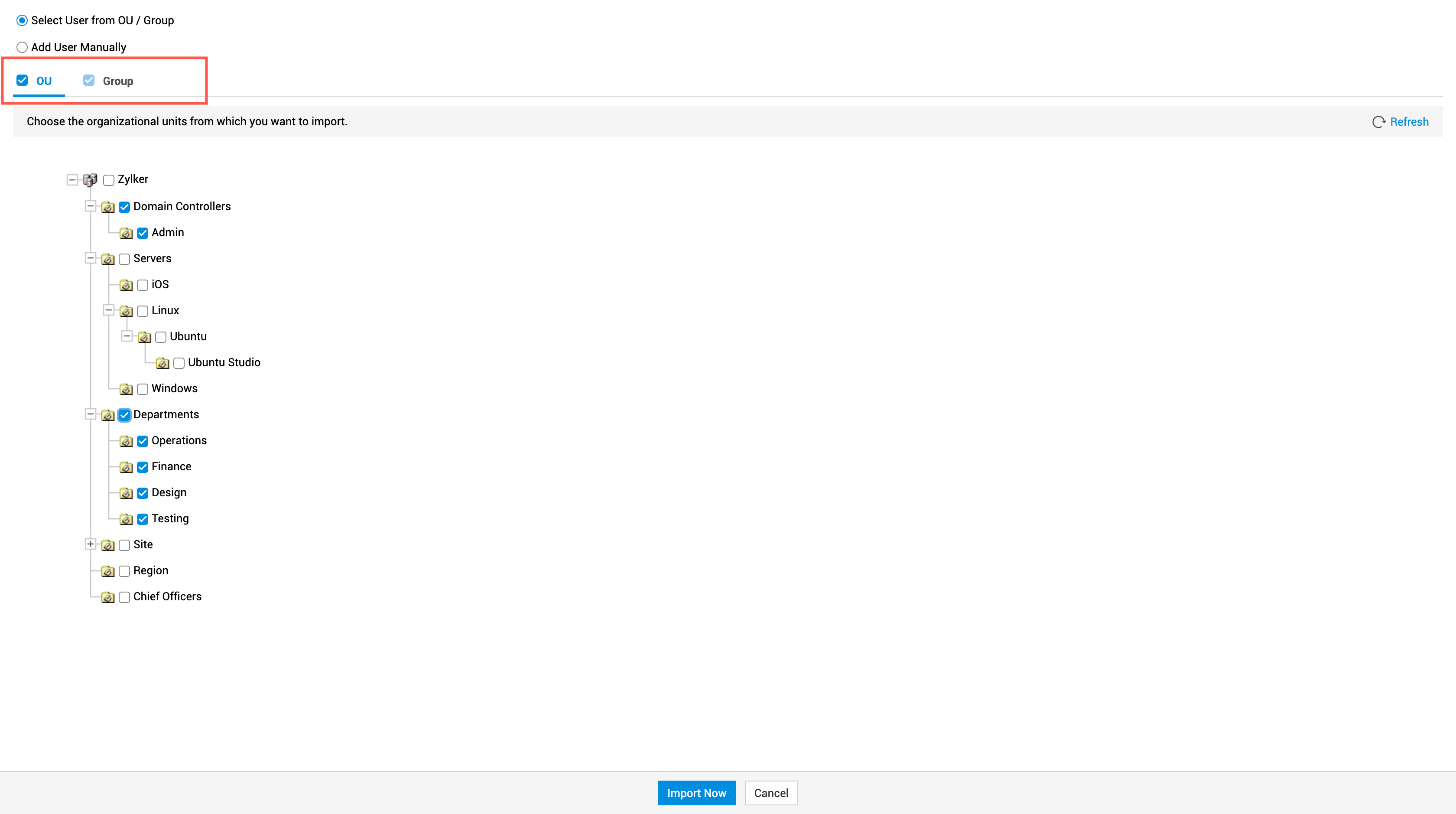 - 要选择 OU,请启用 OU 复选框。通过勾选其旁边的复选框,选择要从中导入用户的 OU。
