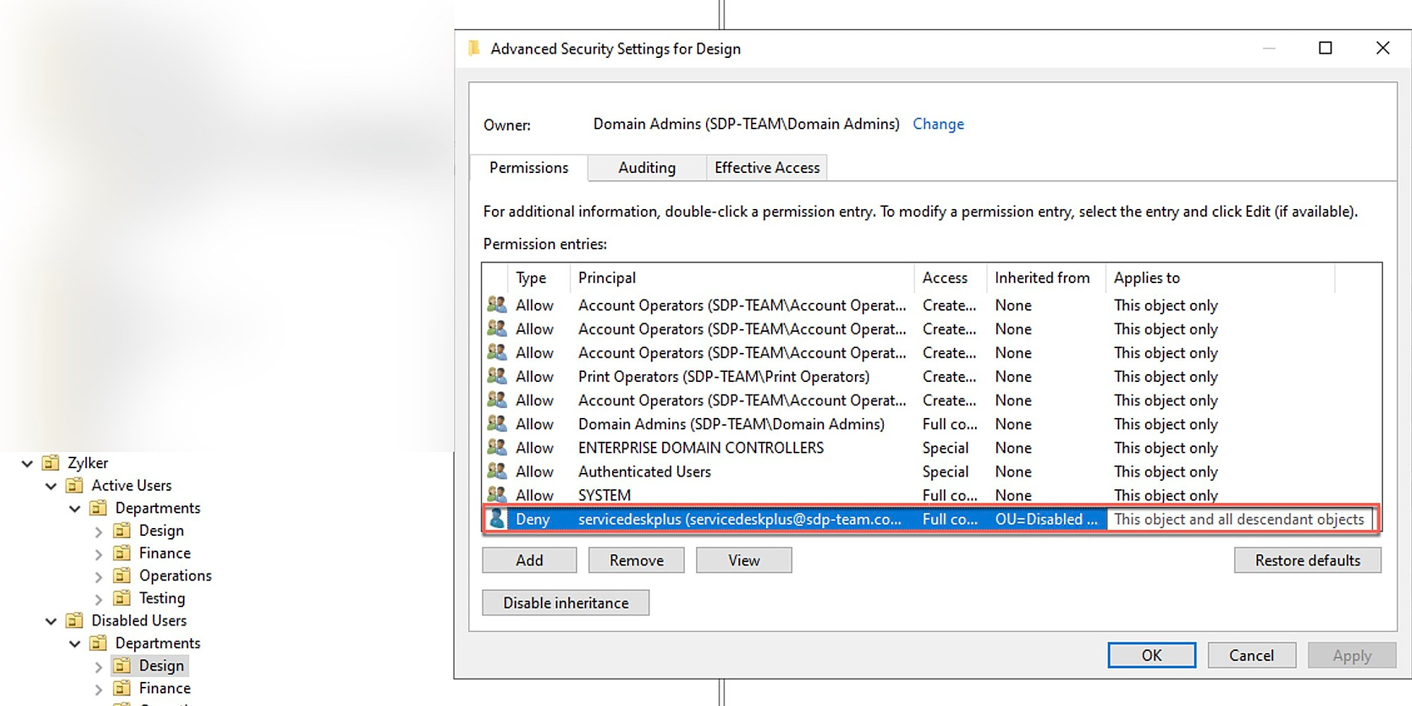 现在,该权限将由 Disabled Users OU 下的用户继承,但其子 OU(Departments 或 Finance)不会继承。
