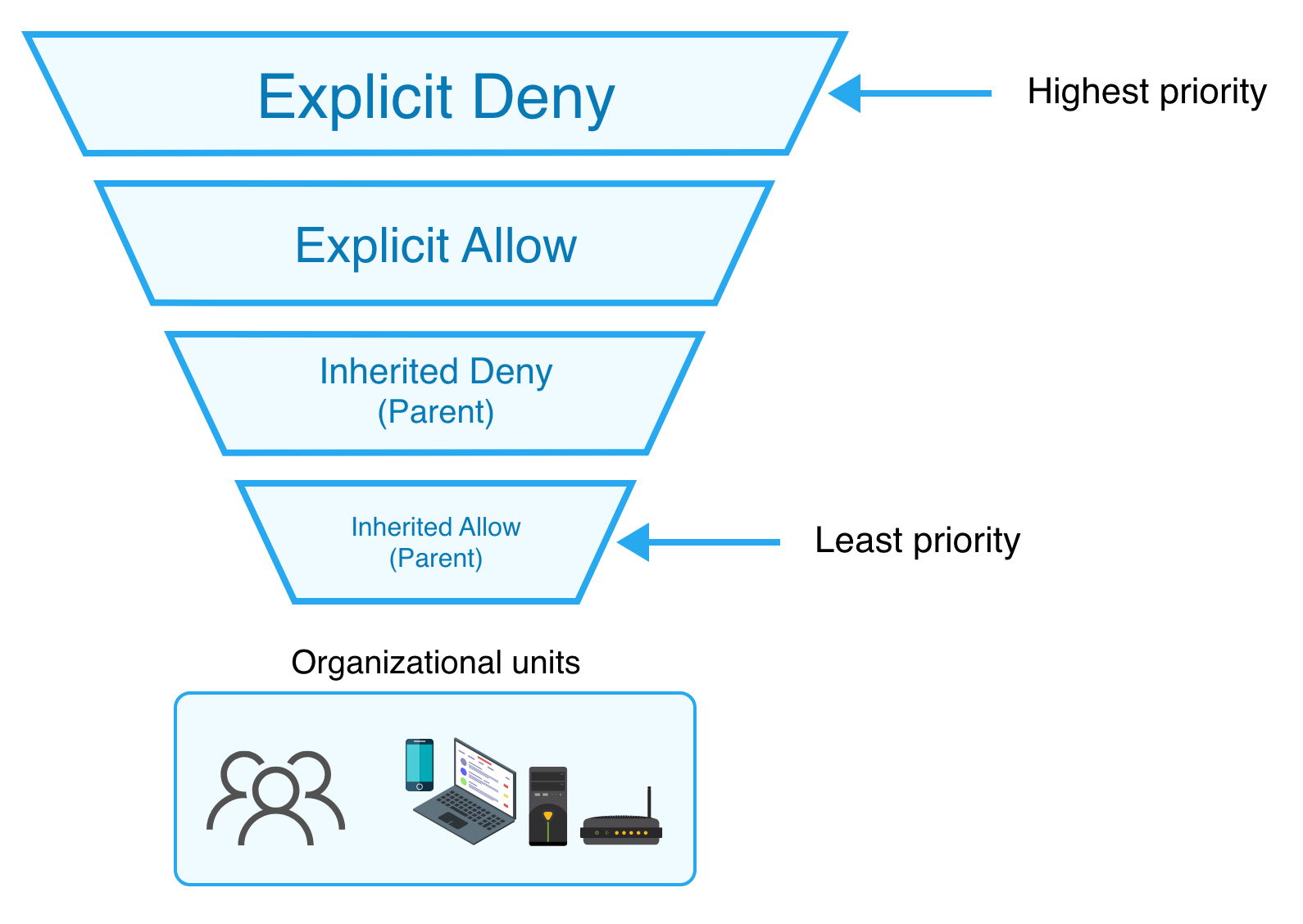 为 OU 配置的权限会被其子对象继承。但是,如果子对象被分配了显式权限,则继承权限会被覆盖。因此,如果将完全拒绝权限应用于父 OU,可能无法对其子对象生效。在这种情况下,我们可能需要删除这些显式权限。