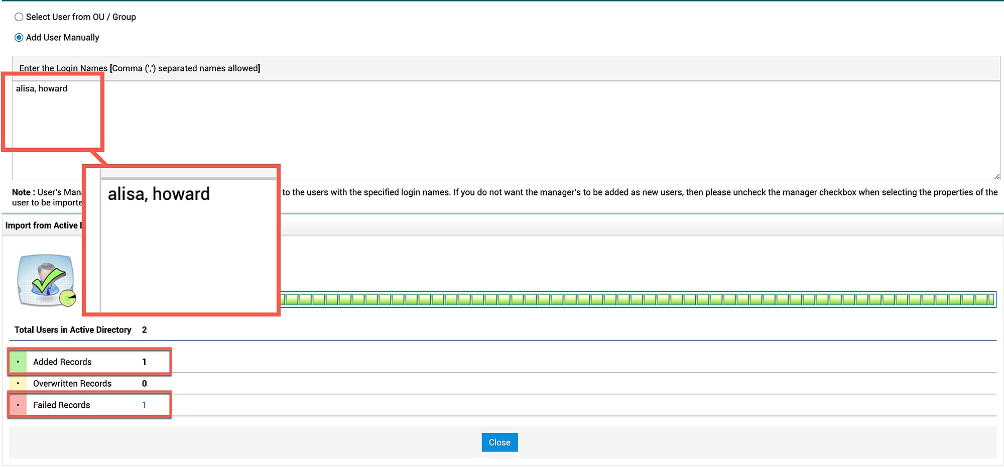 首先,让我们导入 Finance 和 Design OU 下的用户。在手动导入用户时输入登录名时,请输入正确的登录名,并且在登录名末尾不要按 Enter 键。