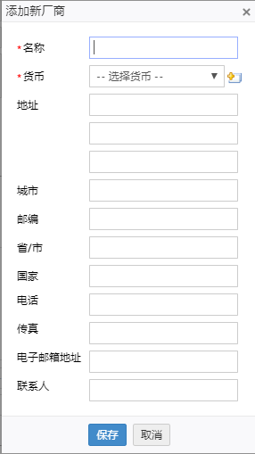 维护厂商是一个下拉框,其中列出所有可用的厂商的名称。可从中选择你需要的维护厂商。如果厂商不在列表中, 可以点击旁边的新添链接。新添厂商的窗口就会被打开。
