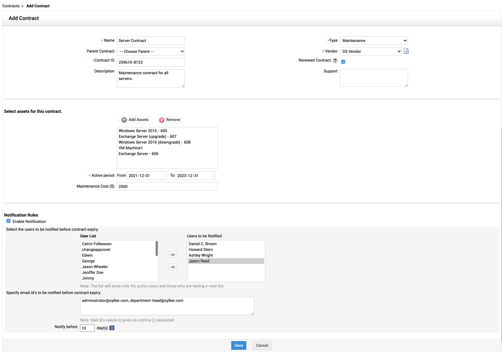 在合同索引页面中单击新建合同。您也可以转到快速操作 > 合同 > 新建。这将打开“添加合同”表单。该表单包含三个主要部分 - 合同详细信息、合同规则和通知规则。