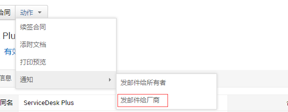 在合同详情页面中,找到动作下拉按钮点击通知厂商。打开发送通知的窗口。邮件的主题为合同id <编号>的通知。