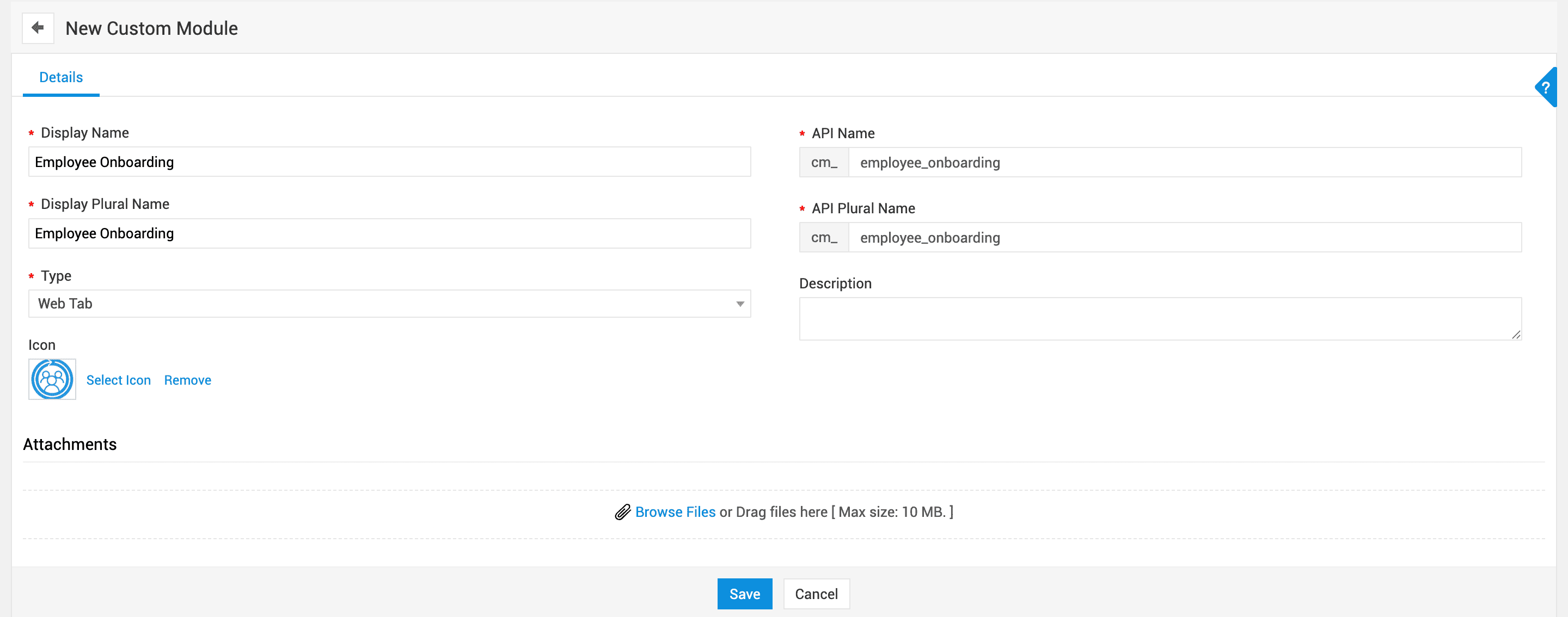 | 显示名称 * | 输入您的自定义模块的显示名称。 | 当引用单条记录时会显示此名称,例如记录表单或记录详情页中。 |