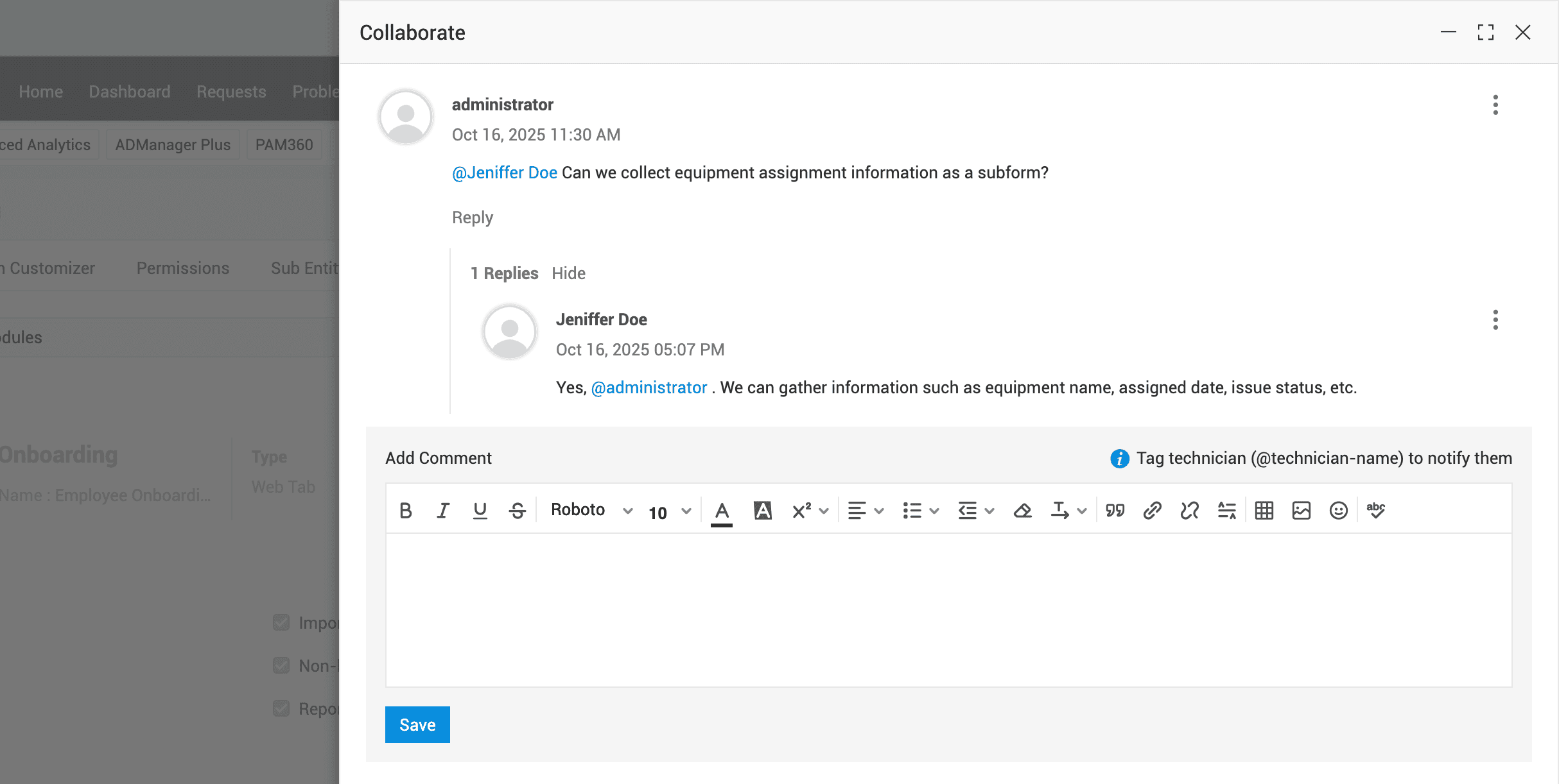 | 根据“耗时”自动填充工作日志开始和结束时间 | 如果启用,结束时间将填充为当前日期,开始时间将根据技术人员输入的 耗时 值自动填充。 否则,开始和结束时间字段将为空并标记为必填。 |