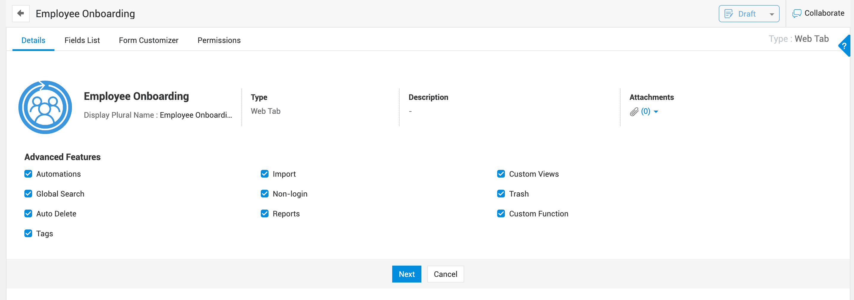 | Web 选项卡 | 创建您自己的模块,用于配置、编辑、存储和删除所需记录。 为了增强自定义模块的功能,您可以启用自动化、报表、导入等高级功能。 | 请求(带有自动化、报表和导入功能) | 导航窗格(类似于内置模块) |