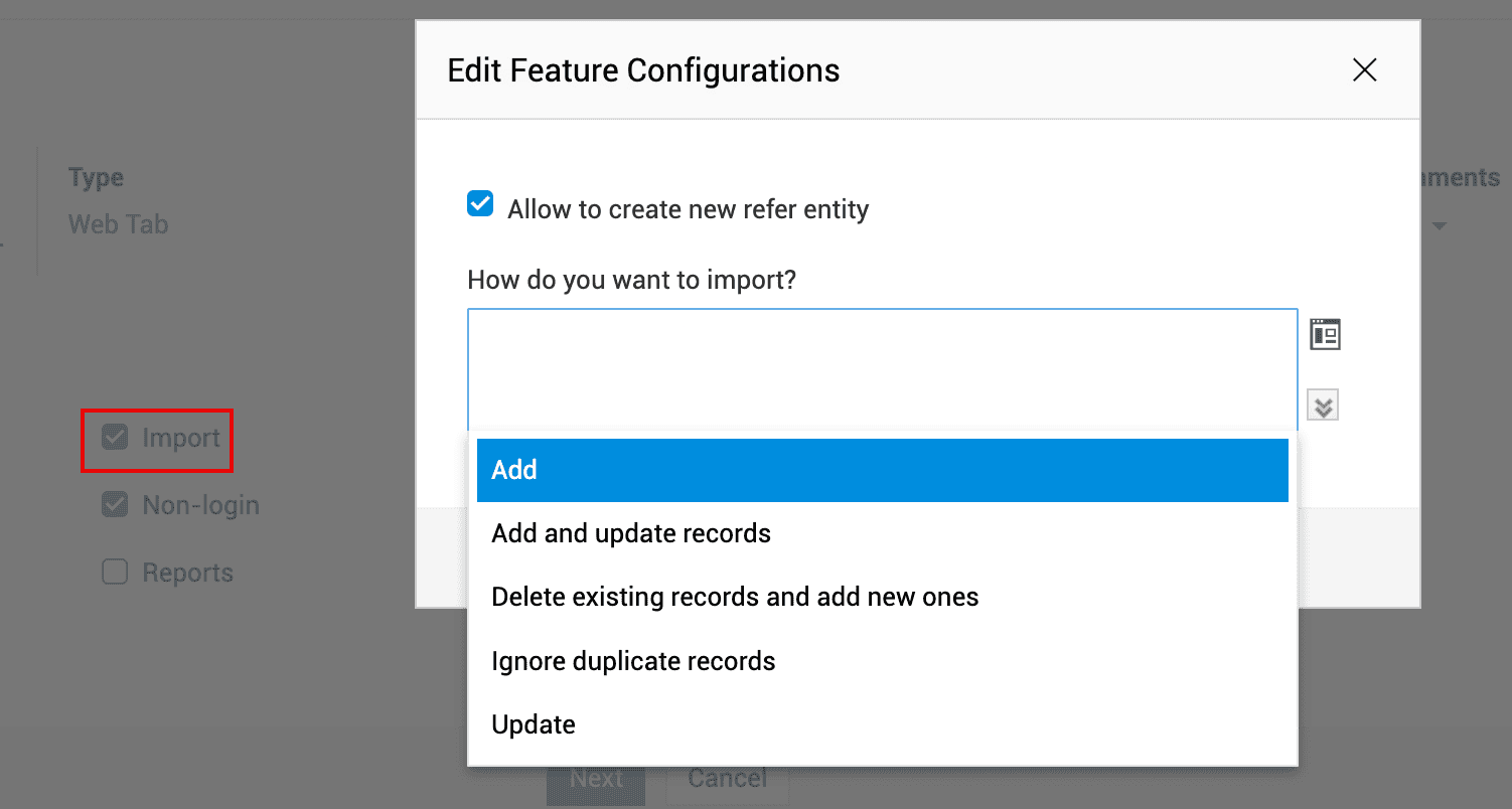 | 导入 | 支持将数据导入自定义模块。 支持的文件格式为 XLS、XLSX 和 CSV。 | 如果启用了 允许创建新的引用实体,系统将在导入期间按以下方式处理新值: 在导入文件中,如果引用自定义配置(通过自定义模块创建)的字段包含未定义的值,系统将: