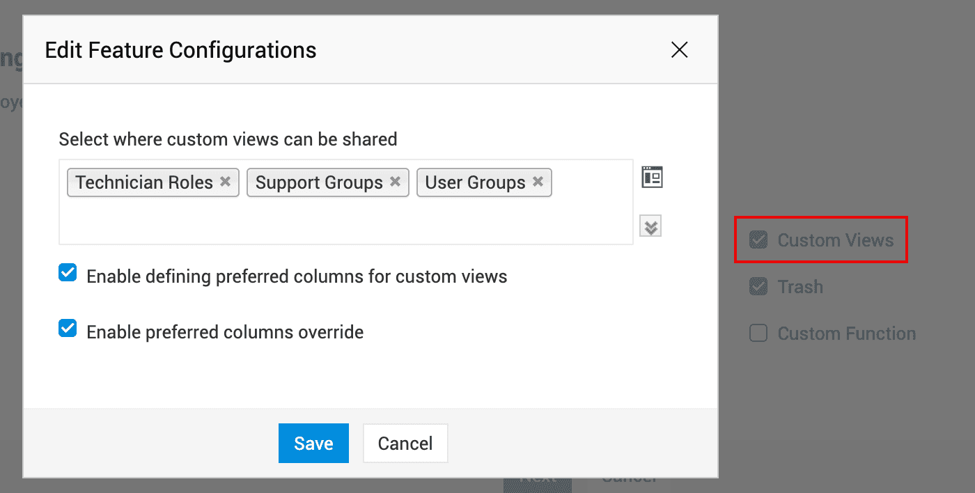 | 自定义视图 | 技术人员可以为符合特定条件的记录创建并共享自定义列表视图。 | 选择自定义视图可共享的位置:选择技术人员可与之共享其自定义视图的角色、支持组或用户组。 启用为自定义视图定义首选列:启用后,技术人员在创建自定义视图时可为其选择首选列。 启用首选列覆盖:启用后,技术人员可选择查看“所有记录”列表视图中的列,从而覆盖该自定义视图的首选列。