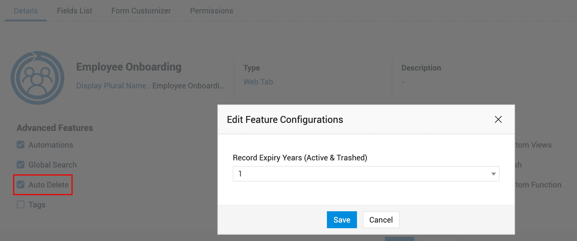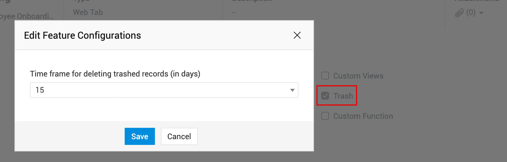 | 回收站 | 技术人员可通过将记录移至回收站,临时从自定义模块中移除记录。 这些记录在恢复之前将保持非活动状态。 此功能有助于避免误删数据。 | 设置恢复期限(15、30 或 45 天),超过该期限且未恢复的记录必须被永久删除。
