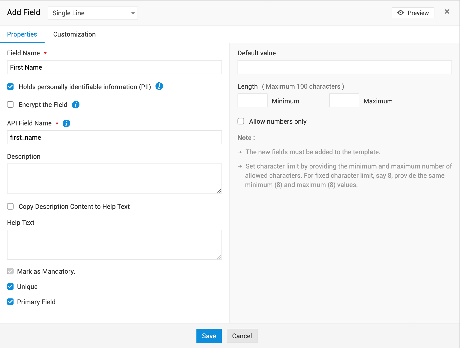 | 加密字段 | 单行、多行、电子邮件、电话 | 启用复选框以加密字段值。这可确保数据库中的敏感信息对未授权用户不可读,并符合数据保护标准。 |
