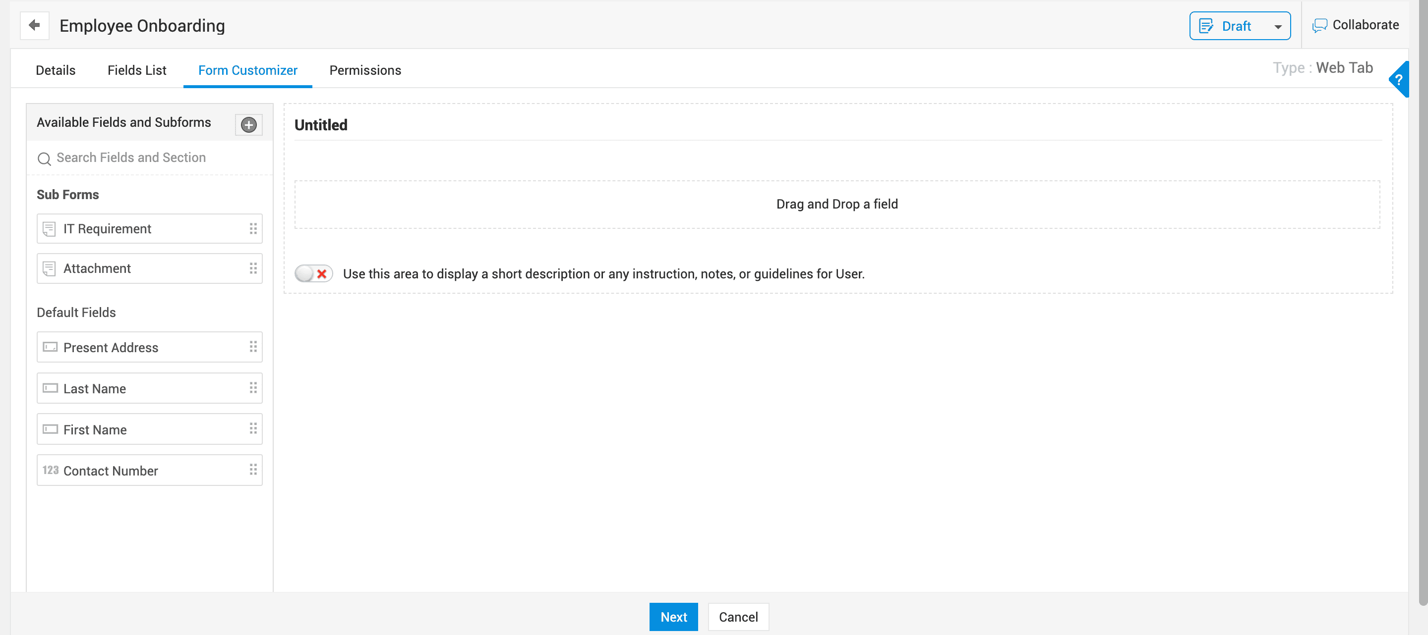 在左侧窗格的可用字段和子表单下,您将看到在 字段列表 下添加的字段、默认子表单以及已发布的自定义子表单列表。