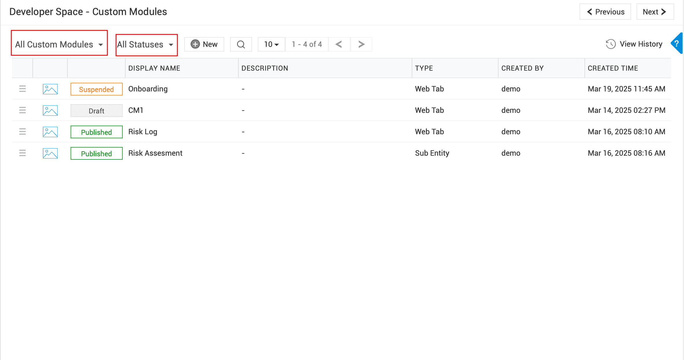 在列表视图中,您将看到所有自定义模块的列表。使用模块和状态筛选器可显示特定类型和状态的自定义模块。
