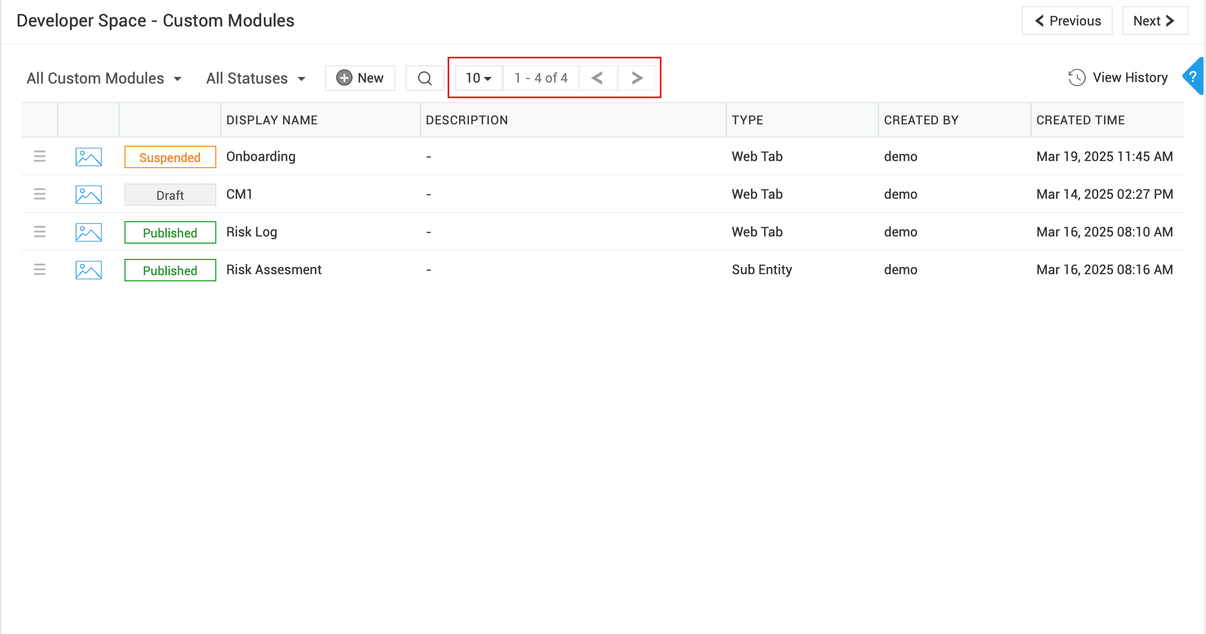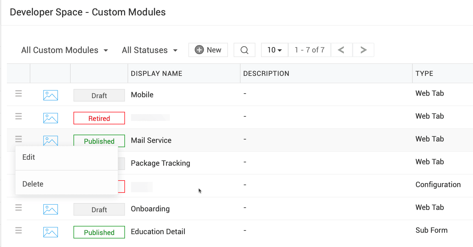 | 已停用 | 自定义模块已被永久禁用,用户无法访问。但是,模块数据将保留在数据库中。 停用自定义模块后,无法对其进行编辑或复用。 |