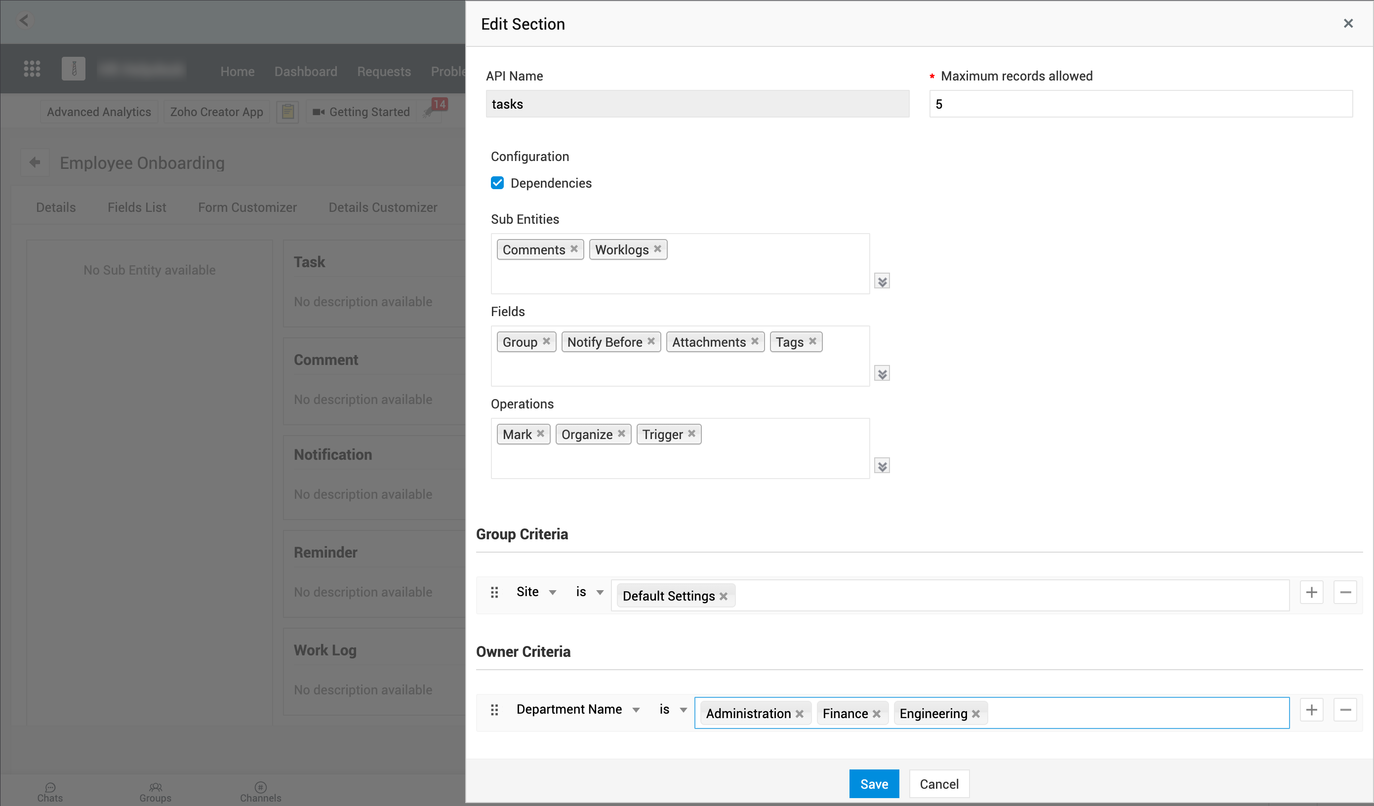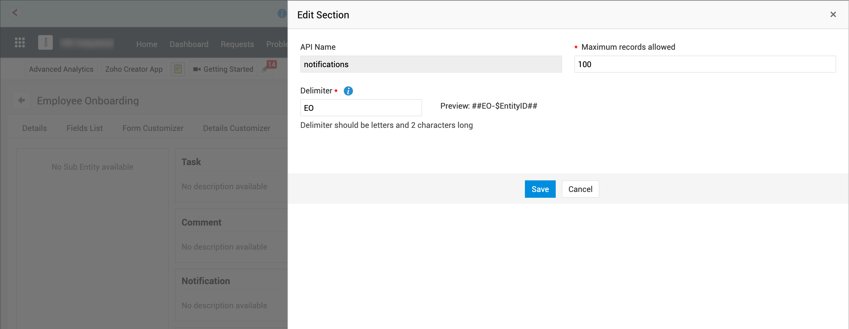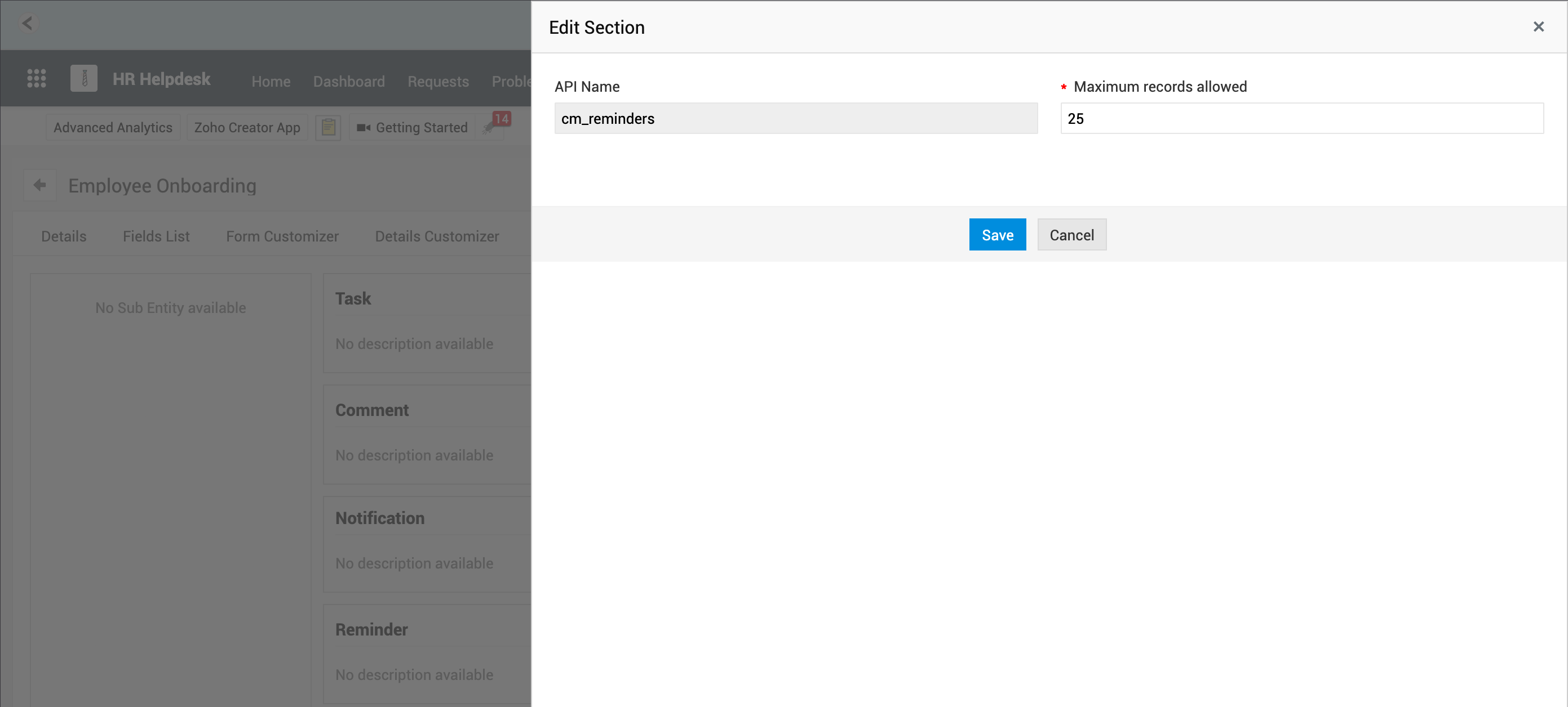 | 子实体 | 创建实体以存储附加详细信息,并在整个生命周期内管理一条记录(父实体)。 | 在项目记录(父级)中,里程碑和任务是子实体,可帮助您跟踪和管理项目。 | 记录的详情页面 |