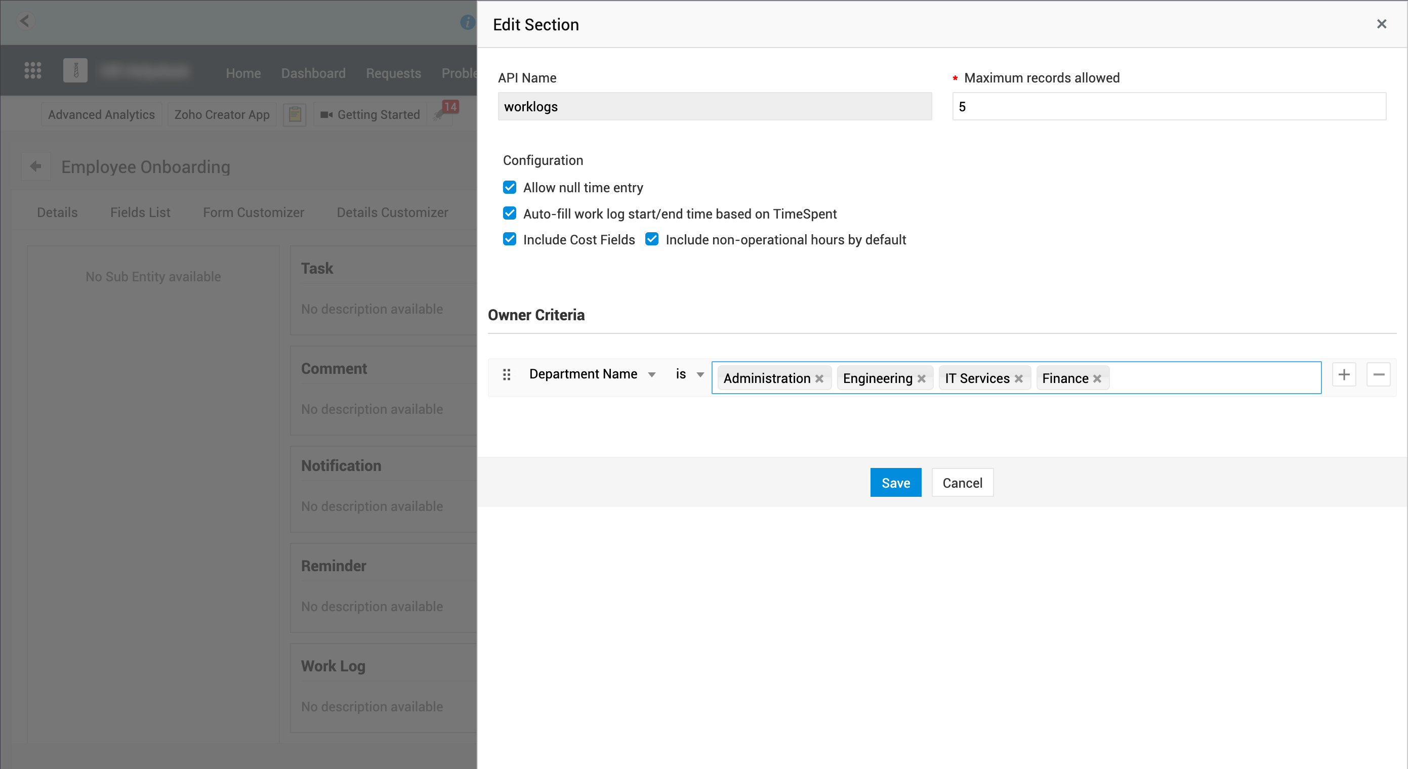 | 包含成本字段 | 启用此选项可在工作日志中采集与成本相关的详细信息,例如费率、总成本或可计费金额。 |