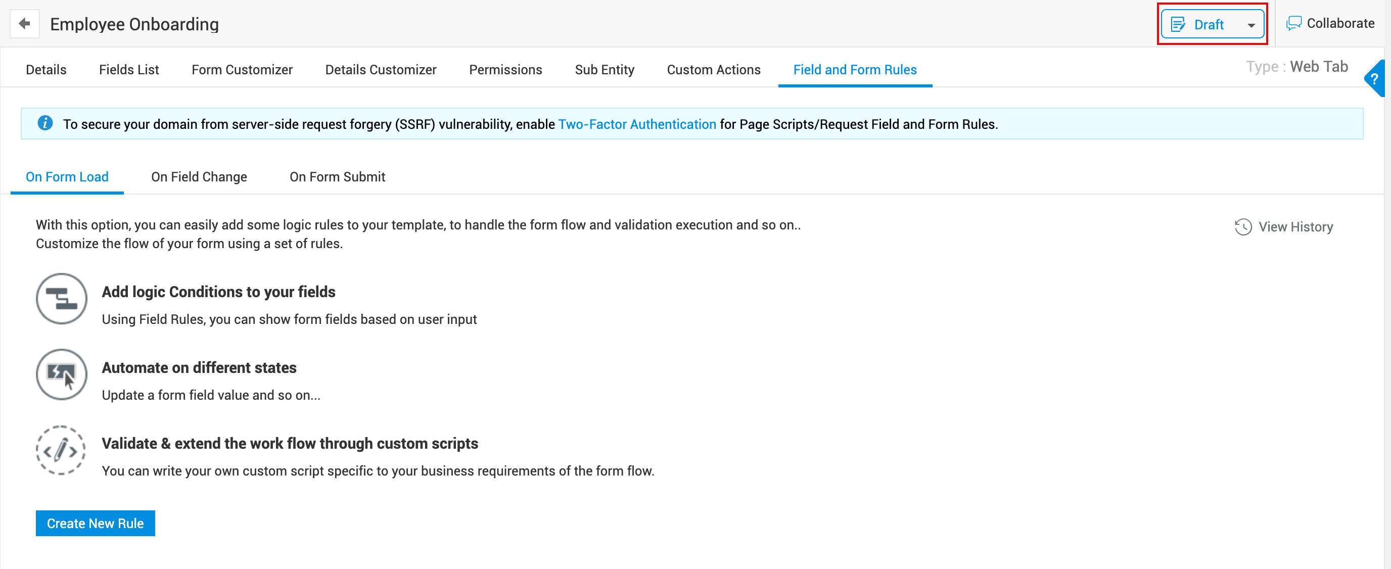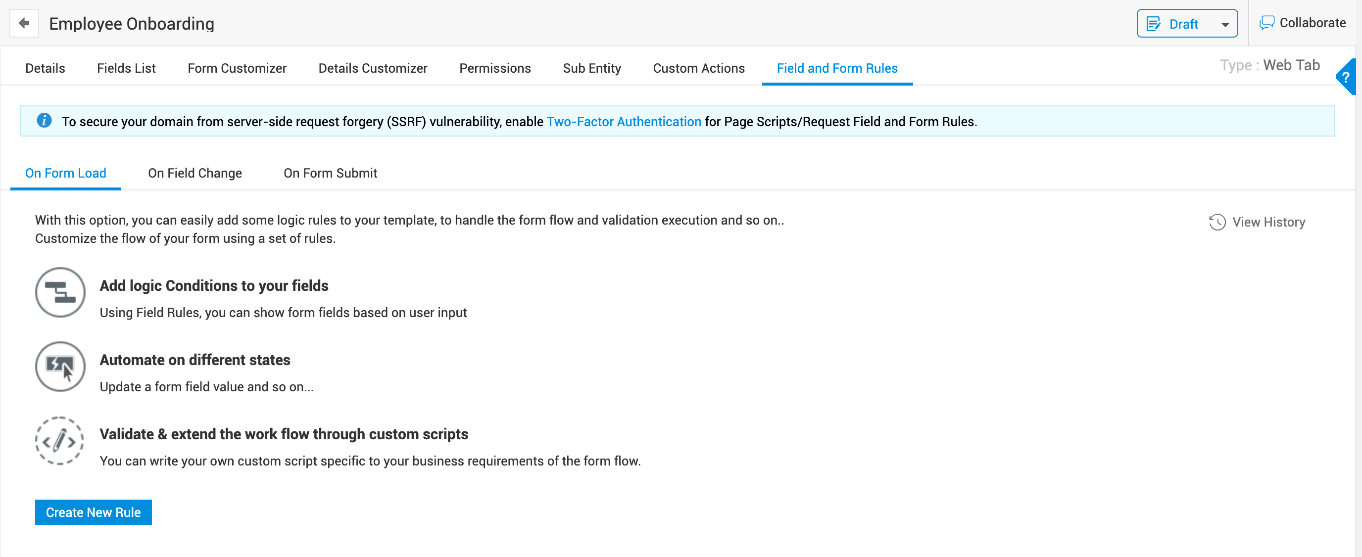 在 字段和表单规则 选项卡中,您可以配置规则,以根据用户输入动态修改模板表单。