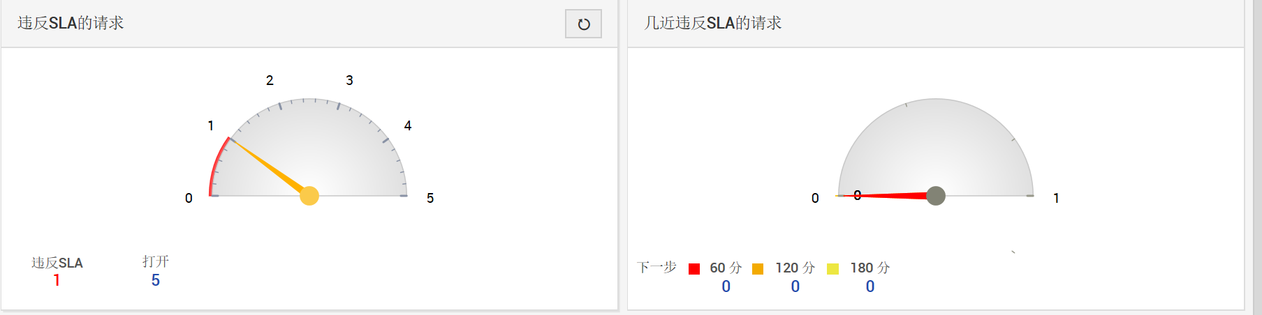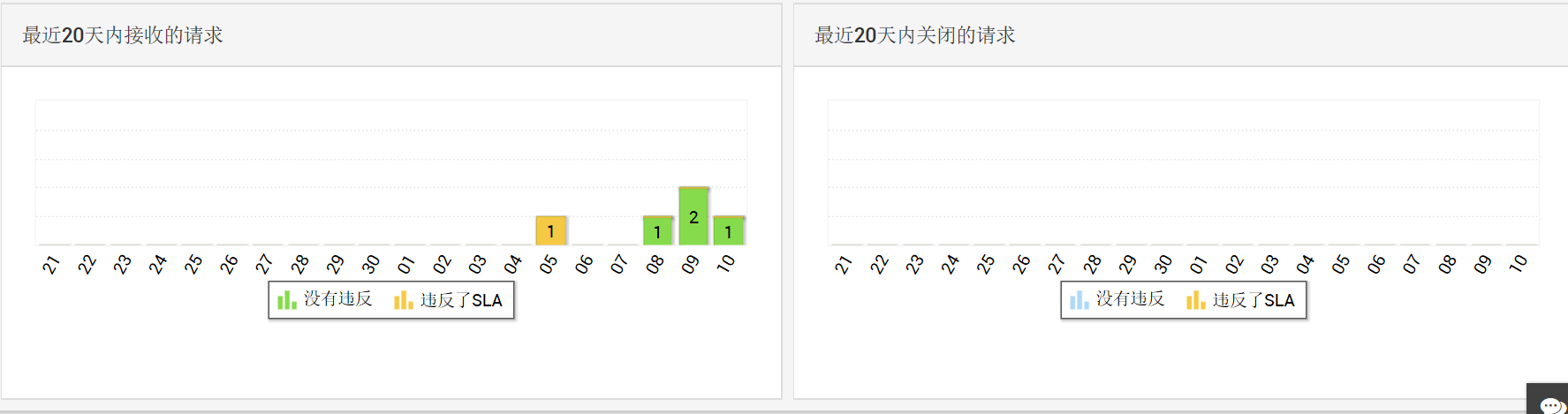 接下来的3个窗口显示了未指派且未处理的请求、接近违反SLA的请求、最近20天内接收的请求、最近20天内关闭的请求 。单击图形上的数字,将打开相应的请求列表以供查看。