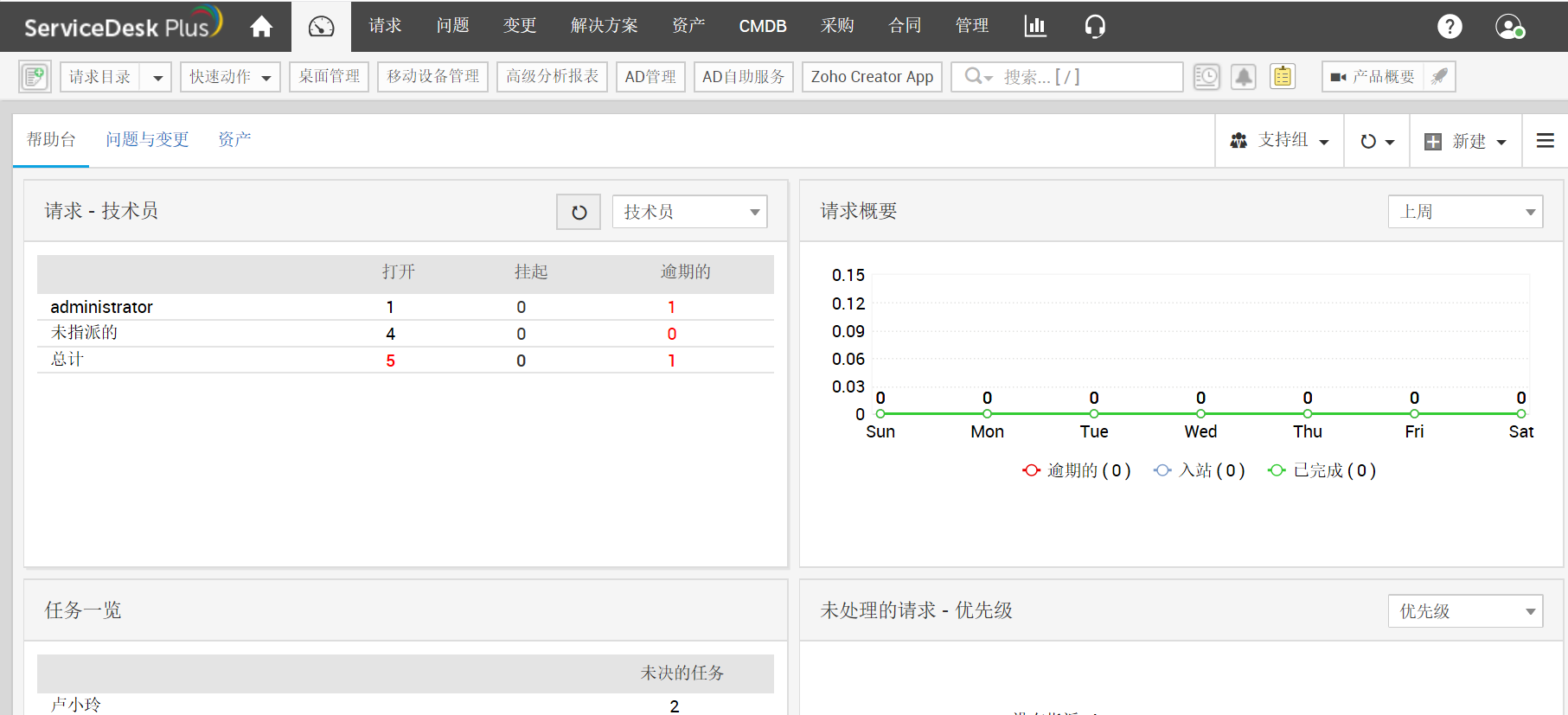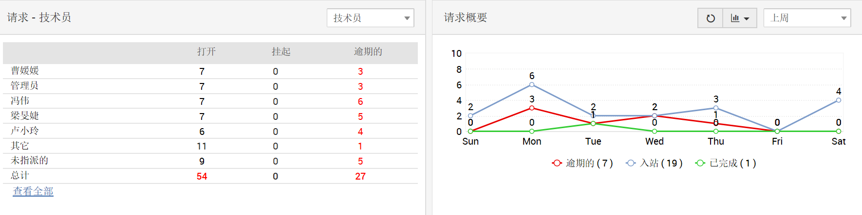 第一个小窗口显示了打开、挂起和逾期的请求。可以根据下拉框中的条件查看这些信息。可以根据技术员、分类、级别、优先级和模式查看请求信息。