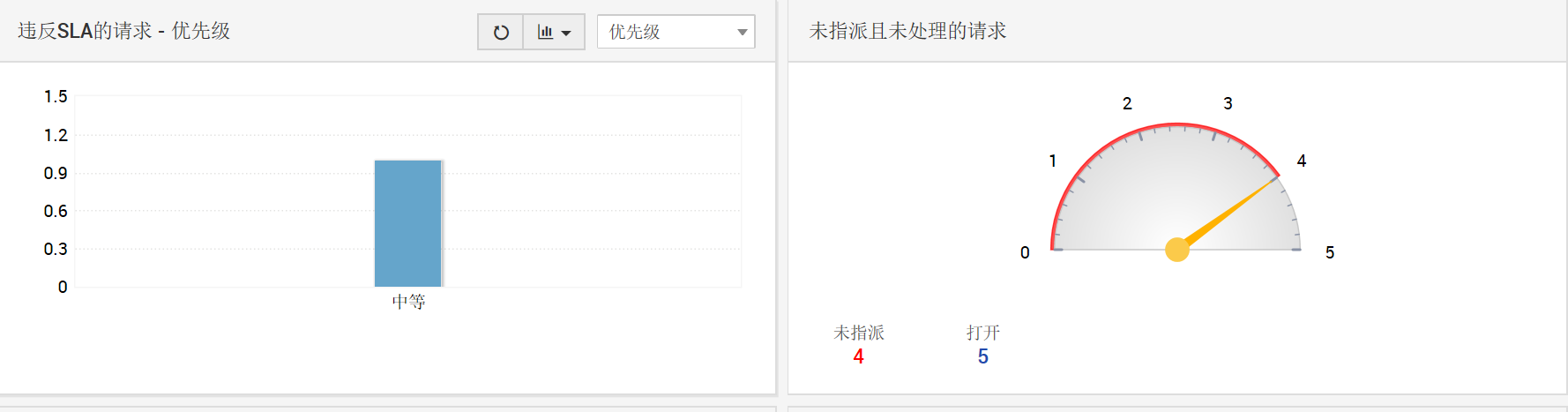 仪表板显示图形化的实时信息,合并排列在一个视图中,以便于对其进行监视。仪表板根据不同的标准显示与请求、变更、问题、资产、软件、采购订单和合同相关的各种统计数据。